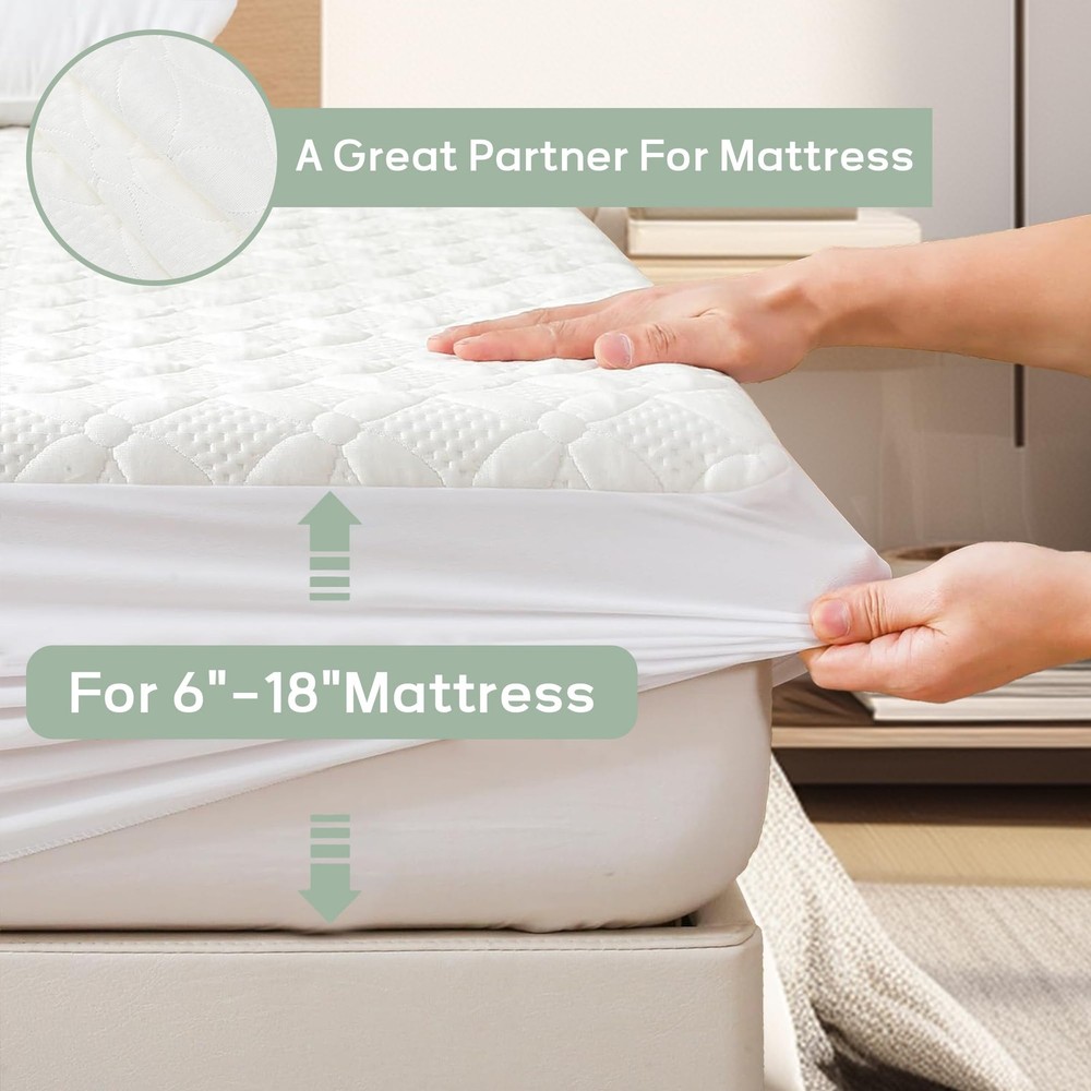 Material: Bamboo fiber Size: Twin:39"×75"×14" Twin XL:39"x 80"x14” Full: 54”x 75”x 14” Queen: 60"× 80"×16" King: 76"× 80"×16" California King : 72"×84"×16" Whether you are looking for a clean sleeping environment or need extra mattress protection, this mattress protector can meet your needs. Designed for a variety of people, including babies, the elderly, dormitory students and pet families, its versatility and high-quality materials provide long-lasting protection for your mattress without compromising comfort. Made of 60% polyester and 40% bamboo fiber viscose blend, this mattress protector is both skin-friendly and soft, and breathable and natural, especially suitable for sensitive skin. Its waterproof and stain-resistant design combined with the noiseless feature makes your sleeping environment fresh, clean and quiet. In addition, a variety of size options and deep pocket design are suitable for mattresses with thicknesses from 6 to 18 inches, providing great convenience for your life. 【Waterproof Design】The inner layer uses a high-performance TPU waterproof membrane to effectively block liquid penetration and protect the mattress from stains, sweat, urine and accidental spills. This barrier design also prevents moisture from entering, extending the life of the mattress. Whether it's a baby wetting the bed, an elderly person spilling drinks, or a pet knocking over a water bowl, this protector can easily handle it. 【Natural Hypoallergenic Material】Made of 60% polyester and 40% bamboo fiber viscose, this protector is not only soft and comfortable, but also hypoallergenic, making it ideal for users with sensitive skin. Bamboo fiber material is known for its natural breathability, which can help regulate body temperature and maintain a refreshing sleeping environment, allowing you to sleep peacefully even in the hot summer. 【Silent Design】The mattress protector will not make a harsh friction sound when turning over. The use of silent material perfectly solves the problem that traditional mattress protectors are prone to noise. Whether adults, children or light sleepers, you can enjoy a high-quality sleep experience without interference all night. 【Multi-Size Compatibility】The deep pocket design of the cover is suitable for mattresses 6 to 18 inches thick, whether you have a single bed, double bed or king bed, it can easily fit. This flexibility makes installation more convenient without slipping or instability. 【Easy To Clean】The machine-washable design is easy to clean and does not require special care. Just put it in the washing machine to wash and dry, and you can reuse it to keep the cover hygienic and comfortable. The durable material ensures that it will not pill or tear after long-term use, which is truly a great value for money. 【Suitable for Variety of People】For dormitory students to protect the mattress from accidental spills. Infant and toddler families effectively prevent urine penetration and keep the mattress clean and hygienic. Pet families resist pet claws, hair and accidental spills. Elderly solve the problem of mattress damage caused by sweat or other reasons.