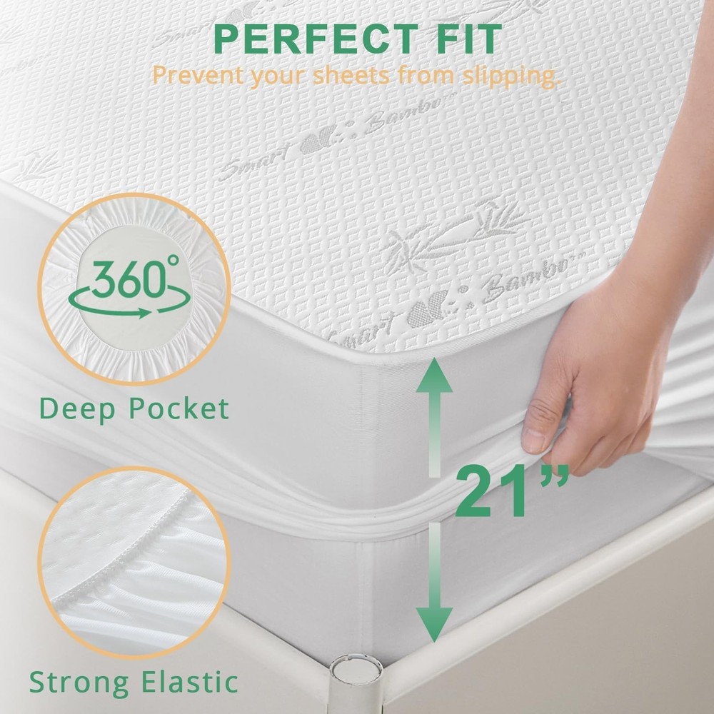 This mattress protector is a game-changer! The bamboo-infused fabric feels incredibly soft and keeps you cool all night, while the waterproof TPU backing is a lifesaver against spills and accidents. The fitted skirt stays perfectly in place—no more waking up to a bunched-up protector. It’s breathable, odor-resistant, and doesn’t make that annoying crinkly sound. So comfortable I forgot it was even there! Highly recommend for anyone who wants to protect their mattress without sacrificing comfort.