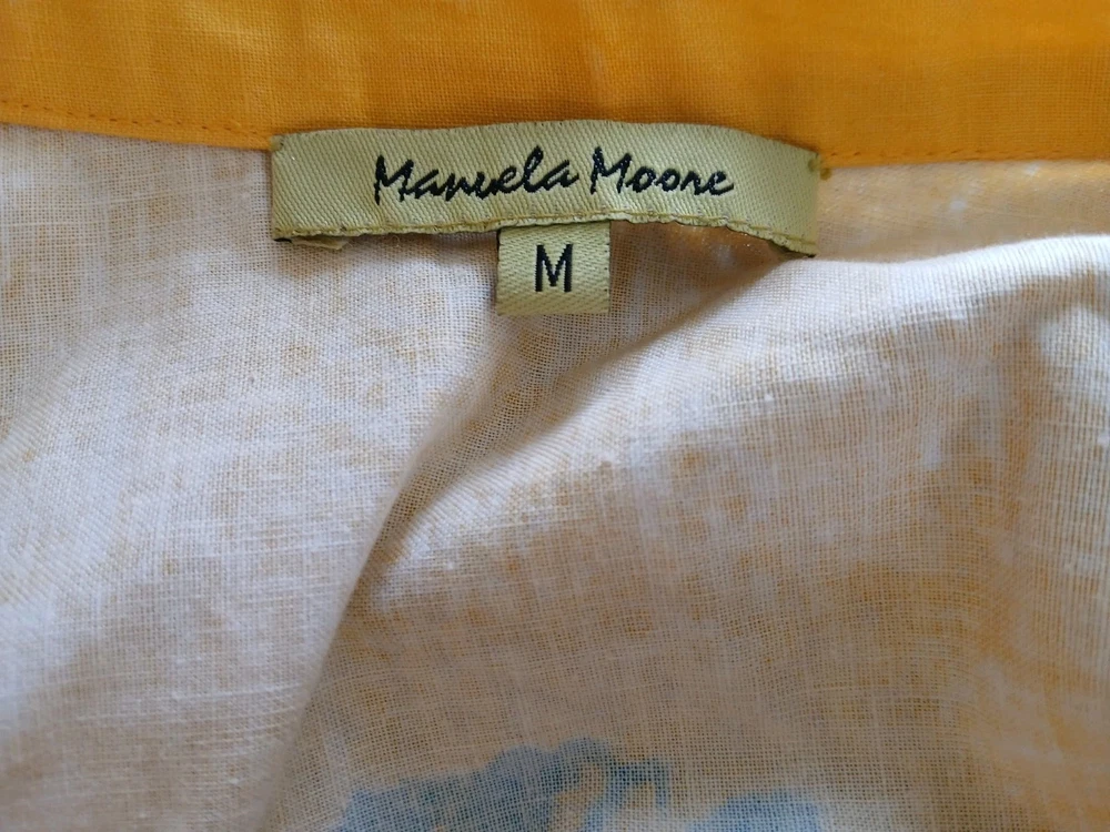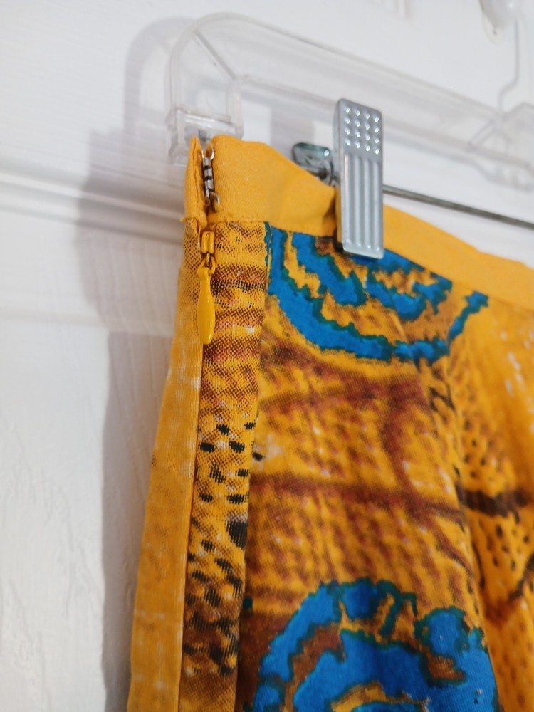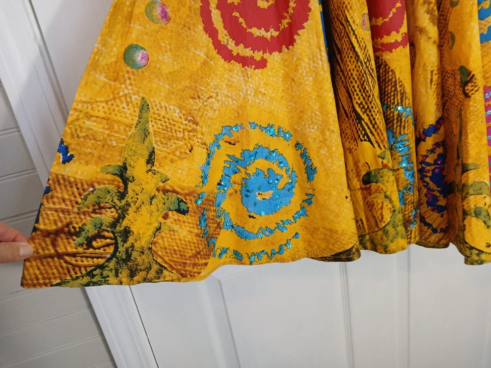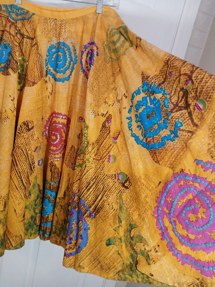 Lying flat the waist band measures 15" Length 31" The vintage beaded bright full skirt by Manuela Moore in size M is a standout piece perfect for those who love rockabilly style. The skirt is made of yellow cotton material and features intricate beadwork, adding a unique touch to your outfit. This art to wear piece is designed to make a statement and elevate your vintage clothing collection with its bold color and attention to detail.
