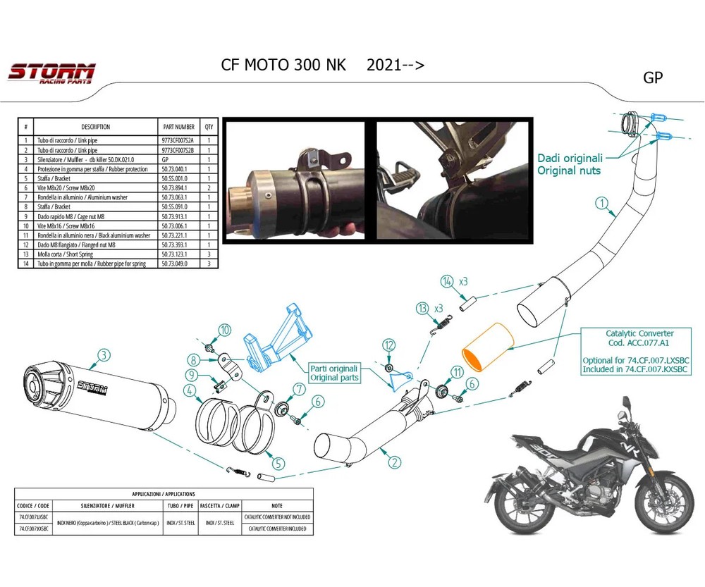 Full System Exhaust Storm by Mivv Muffler GP Black Steel with Carbon End Cap for CF Moto NK 300 2021 > 2024 Product code 74.CF.007.LXSBC Compatibility: Brand: CF MOTO Model: NK 300 Cc: 300 Years: 2021 > 2024 Configuration: [ GP ] - FULL SYSTEM EXHAUST - (High Passage) Dressing: Black Stainless steel with carbon end cap NOTE: EURO 5 APPROVED ONLY WHEN ACC.077.A1 CATALYST IS INSTALLED Homologation NOISE db(A): ECE approved if optionally catalysed (Euro5) Exhaust gas CO2: ECE approved if optionally catalysed (Euro5) All pictures shown are for illustration purpose only. Actual product may vary due to specific product application. Storm is a brand owned by Mivv Company , an Italian company specializing in development and sale of OEM and aftermarket exhaust systems for motorcycles , entirely made in Italy. Created in 2006, the Storm brand aims to combine quality , which for half a century has distinguished the Mivv production, to products with a unique sound . Storm exhausts are developed with the same techniques used in Mivv products, sharing the high technological level, the result of continuous R&D work and the experience acquired by the company in competitions , thanks to the cooperation with teams involved in national and world championships. Ref: 455671_74.CF.007.LXSBC