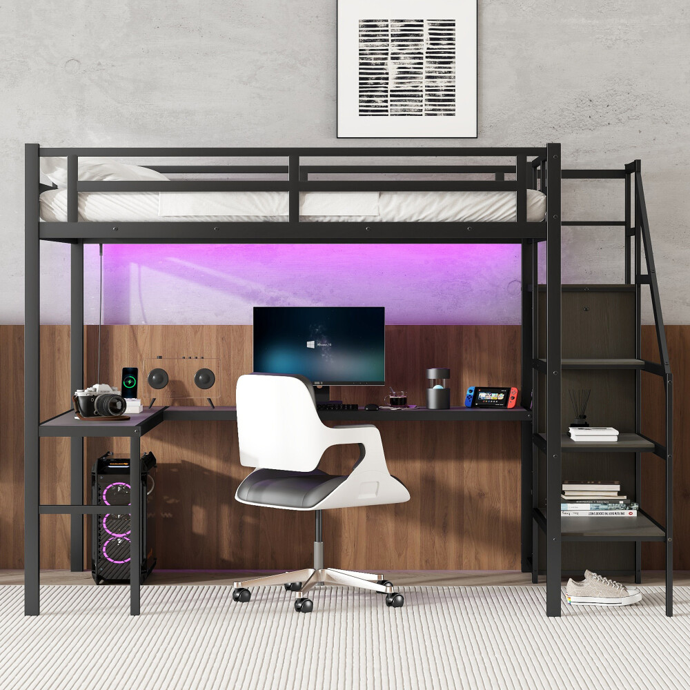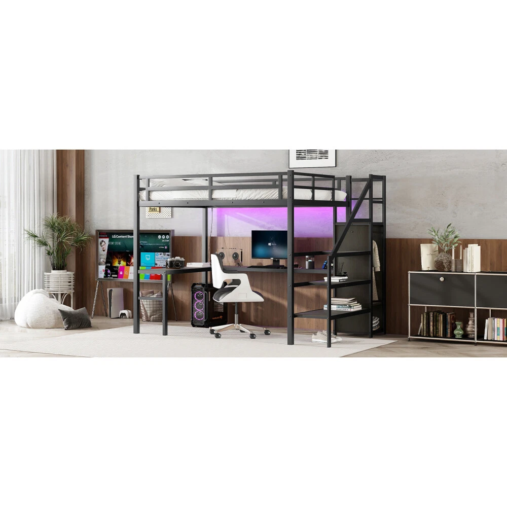 Full XL Size Loft Bed with Wardrobe and Stairs - The loft bed has a wardrobe that comes with its own hanging rod and an adjustable divider at the bottom, which can be used to store quilts, storage boxes or shoes. The versatile built-in staircase can also be used as storage space and can be fitted left or right as required. Space-Saving Loft Bed & Workspace - This metal loft bed has a cozy sleeping space, and a spacious and practical L-shaped desk underneath that can be used as a workbench, reading area, etc. where you can create your own little world. The space-saving design adds a touch of elegance to any bedroom. Loft Bed with USB and LED - The full xl size bed's desk comes with a USB charging station for charging electronics that is convenience to your daily life.The LED light strip adds a sense of ambiance to your room while making it easy for you to wake up at night. Solid Metal Loft Bed - The bed frame is made of metal for strength and stability, and the upper bunk can hold up to 350 pounds. Full XL size loft bed frame comes with sturdy stairs so kids can safely climb to the upper bunk and full-length guardrails keep kids safe while sleeping. Easy Assembly - Some assembly will be required, each order comes with clear and detailed instructions and numbered parts with all the necessary tools so you can get your bed assembled quickly. Notes: This metal loft bed will be packaged in two boxes, excluding the mattress! Description If you need a versatile bed, our metal loft beds are the perfect choice. The full xl-size upper bed provides you with plenty of sleeping space, and the desk below is the perfect area to work and study. In addition, the full xl size loft bed comes with a built-in closet that can be used for storing your daily clothes and supplies, and the interchangeable left and right staircases allow for storage while keeping it sturdy. The USB and LED lights are designed to provide you with great convenience. Quality metal materials and a minimalist black design make this loft bed an eye-catcher in the bedroom.