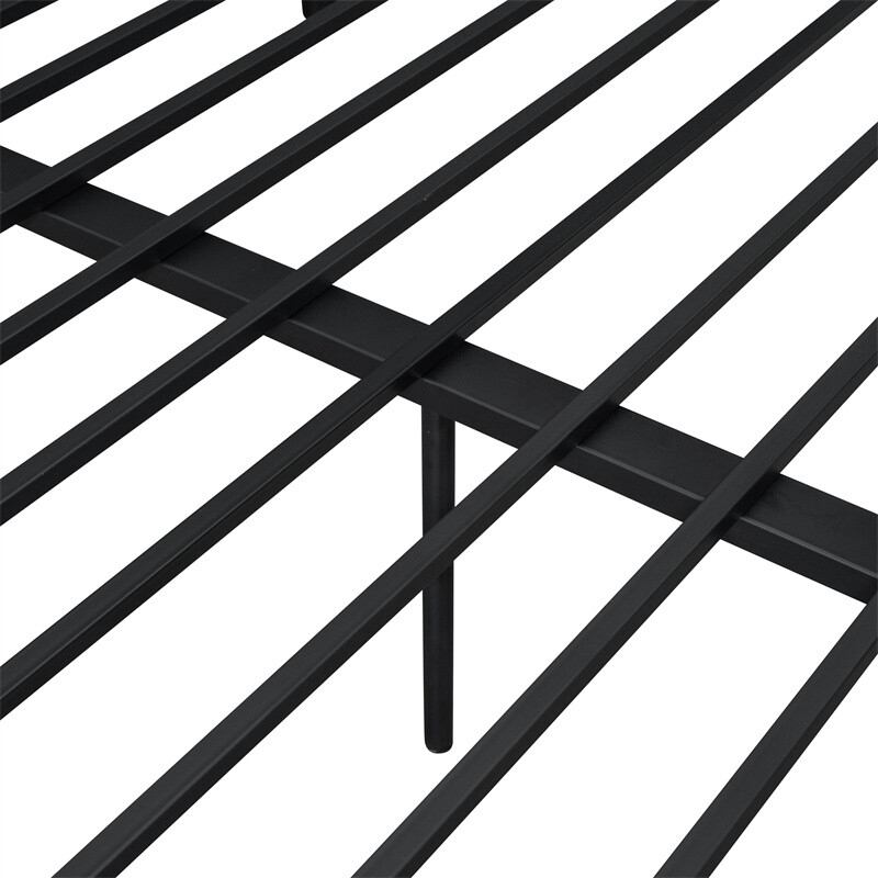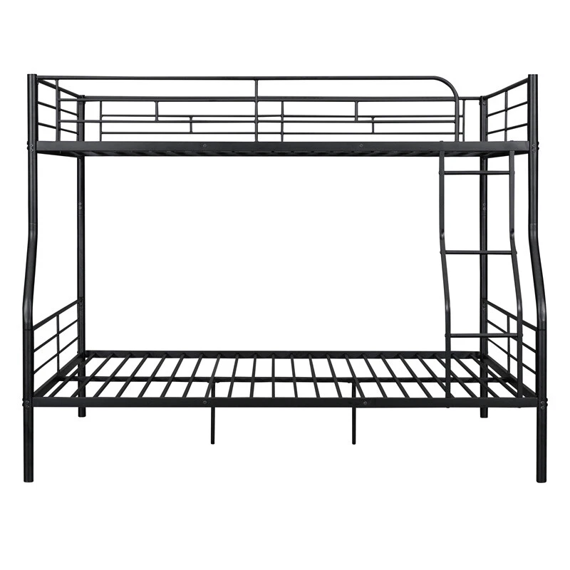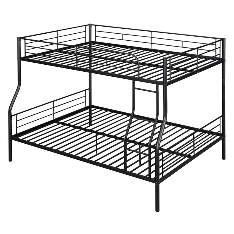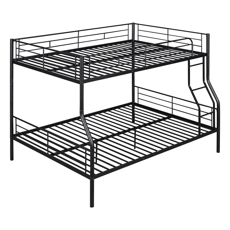 Specification Product Information Product Type:Combo Item Product Name:Full XL Over Queen Metal Bunk Bed Main Color:Black Main Material:Iron Product Dimensions Assembled Length (in.):83.00 Assembled Width (in.):62.60 Assembled Height (in.):65.30 Weight (lbs.):103.62 Package Size Package Quantity: 1 83.66 * 14.17 * 6.1 in. 88.18 lbs. Package Quantity: 2 56.5 * 14.17 * 3.94 in. 26.46 lbs. Product Features [Contemporary Build] The simple yet contemporary bunk bed is a modern classic, featuring a streamlined iron-crafted frame complimented by an eye-catching chrome finish.It will be well matched with your home decor. [Crafted For Safety] Designed with safety in mind, this bunk bed has a weight capacity of up to 250 pounds on top and 350 on the bottom that can handle multiple people at once, while also including full length gridded guardrails that run alongside the upper perimeter. [Save Space or Split Into 2 Beds] An ideal space-saver and a perfect addition for a growing family, the bunk bed efficiently accommodates little ones, and young teens, allowing them the freedom and space to host friends and also offering a sleeping solution for younger sibling that share bedroom space - split the single bunk into two individual beds with ease if you move into a bigger home or your needs change. [Easy Assembly]The bunk bed is delivered in two packages, along with the installation manual and full set of hardware necessary to guide you through the process of assembly, and the bed will definitely be assembled conveniently. [Dimensions] Overall Product Dimension: 83"L x62.6"W x65.3"H. Mattress is not included. Some assembly is required, although we have provided clear instructions and tools. Description The simple yet contemporary bunk bed is a modern classic, featuring a streamlined iron-crafted frame complimented by an eye-catching chrome finish. Manufactured with support you can rely on, the bunk bed is constructed with a sturdy Quality Tested iron frame that eliminates excess wobbling while adding solid stability and durability allowing users to sleep soundly.An ideal space-saver and a perfect addition for a growing family, the bunk bed efficiently accommodates little ones, and young teens, allowing them the freedom and space to host friends.This bunk bed will be a beautiful and practical piece in your bedroom. Weight & Dimensions Overall Product Dimension 83"L x62.6"W x65.3"H Detail Product Dimension Please refer to the Size image Number of Package 2 Package Dimension Please refer to the Specification Overall Product Weight 103.62 LBS Package Weight Please refer to the Specification Weight Capacity Upper Bed:250lbs;Bottom Bed:350lbs Recommended Mattress Thickness Upper Bed:6 inch Max;Bottom Bed:8 inch Recommended age > 6 years old Specifications Product Type Bunk Bed Size Full XL over Queen Color Black Material Iron The number of slats 22pcs+22pcs Assembly Required Yes Notes Manual measurement has been used,there may be some reasonable error.All the pictures are taken by actual samples, slight chromatic aberration may occur due to lighting or display.