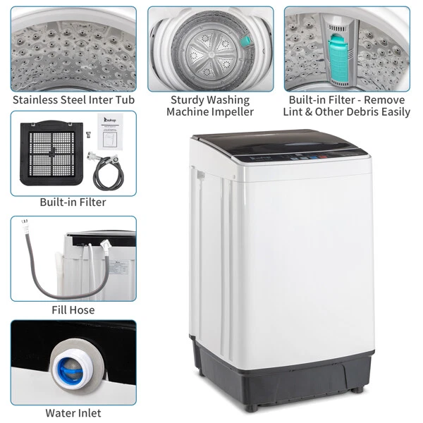 This washing machine is a game-changer! Compact yet powerful, it handles up to 17.6 lbs effortlessly. The full-automatic feature makes laundry a breeze, and the top-load design is super convenient. Despite the factory water test, it arrived clean and ready to use. Perfect for small spaces without sacrificing performance—highly recommend for hassle-free washing!
