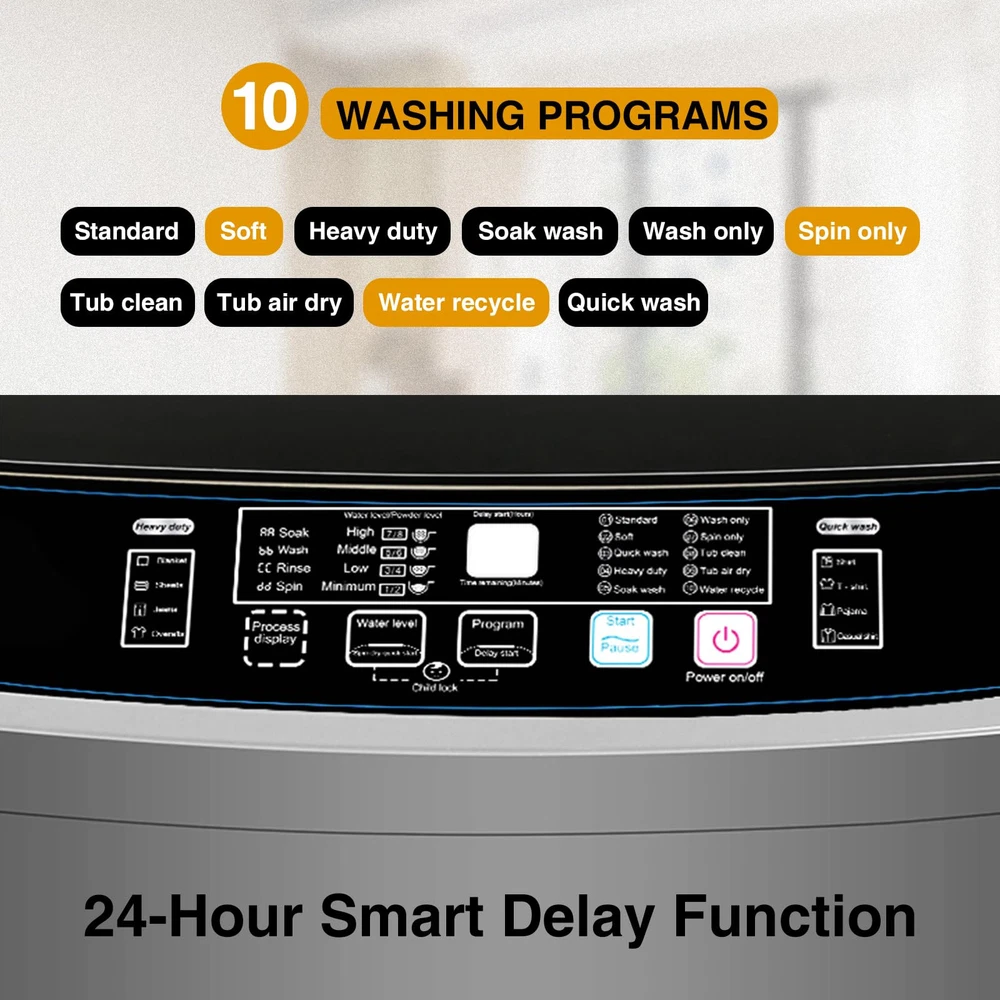 【Versatile Control Panel】The full automatic washing machine features a multi-functional control panel with 10 washing programs, 4 water level modes, and 8 water level selections for added convenience. The LED display provides clear visibility of the laundry time, while the child lock ensures the washing machine operates safely to protect your family. 【Family-Friendly Capacity】With an inner tub capacity of 17.7 lbs, this portable washer is perfect for families with 3-4 members. The washing machine includes highlighted reference weights for different types of clothes in both the description and images, making it easier for you to load laundry and save energy and effort. 【Portable and Space-Saving Design】Ideal for households with limited space like RVs, camping sites, dorms, and apartments, our washing machine is compact and convenient. It requires minimal storage space and is pre-assembled for hassle-free operation, offering an easy and space-saving laundry solution. 【Automatic Imbalance Adjustment】Unlike other portable washers that may shake or vibrate excessively during washing or spinning, our laundry washing machine is equipped with an automatic imbalance adjustment system. This feature ensures safety, minimizes noise, and provides a stable laundry experience for you and your family. 【Effortless Full Automatic Operation】Designed as a 2-in-1 compact washer, this portable washing machine offers full automation. Simply select the washing and spinning program along with the water level, and let the mini laundry washer work independently without constant supervision. Save time and focus on other important tasks while the machine takes care of your laundry needs.