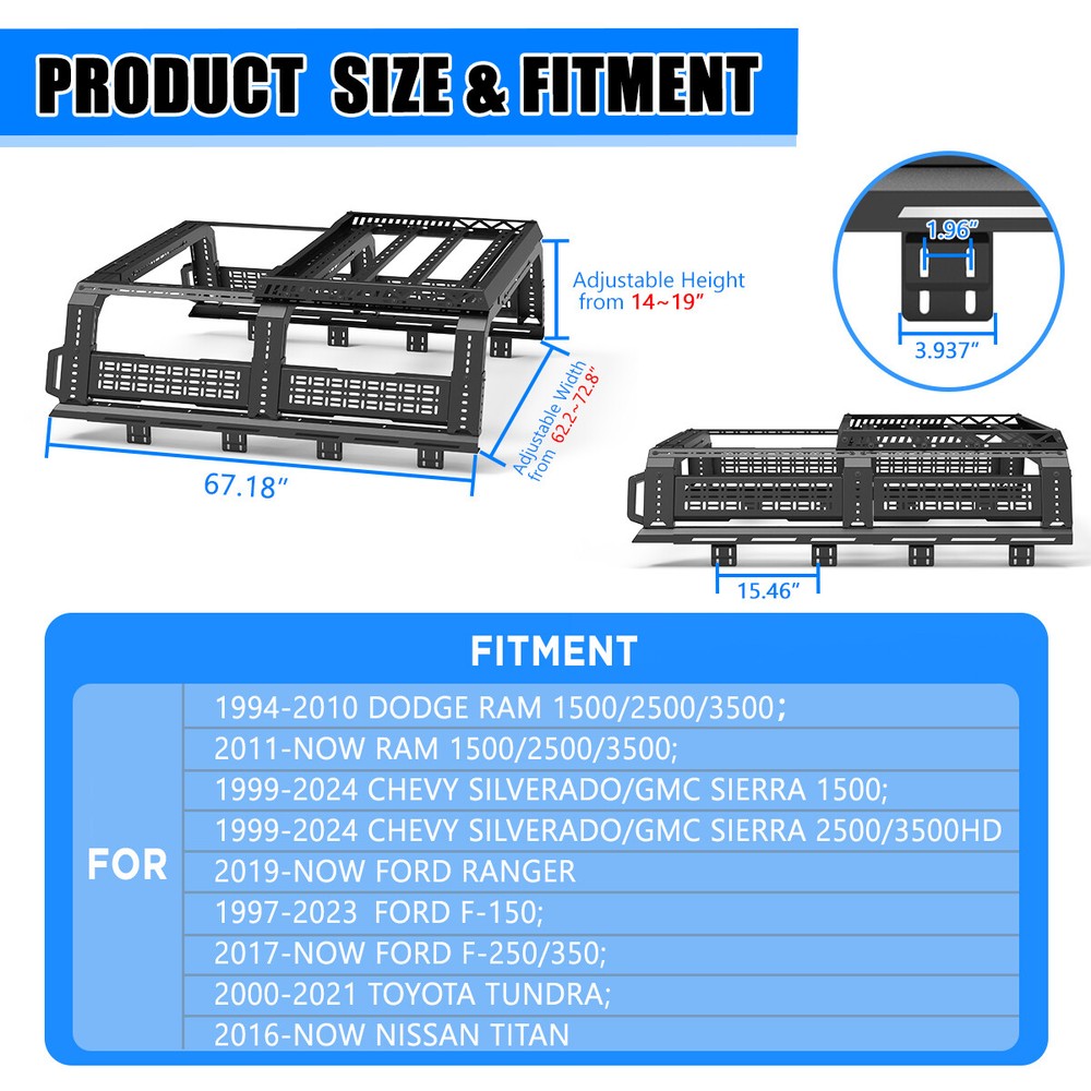Title Other Head Lights For Jeep For Ford For Dodge For Chevy/GMC For Honda For Toyota For Nissan For Subaru For Mazda For Acura For Mitsubishi For Audi For MINI Tail Lights For Jeep For Dodge For Chevy/GMC For Toyota For Nissan For Honda For Volkswagen For Mazda For Subaru For Isuzu For Mitsubishi For Cadillac For MINI Fog Lights For Jeep For Ford For Honda For Dodge For Toyota For Chevy/GMC For Nissan For Mazda For Subaru For Infiniti For Cadillac For Scion For Lincoln For Acura For BMW For Hyundai For Volkswagen For Buick For Chrysler For Lexus For Mercedes Benz For Kia For Audi For MINI Turn Signal Lights For Jeep For Ford For Dodge For Chevy/GMC For Toyota For BMW For Subaru For Nissan For Cadillac For Lincoln Full-Size Pickup Overland Bed Rack Adjustable Truck Cargo Carrier For Dodge Chev Note: This link belongs to a variety of combinations, you can choose your favorite style to purchase. Specification: 100% Brand New & High Quality Material: Steel Type: Modular Overland Bed Rack Mounting Hardware: Included Finished Surface: Anti-corrosion Textured Powder Coating Adjustable Width: 62.2-72.8 inches Adjustable Height: 14-19 inches Fitment: Fits 1994-2010 Dodge Ram 1500/2500/3500 Fits 2011-2024 RAM 1500/2500/3500 Fits 1999-2024 Chevy silverado/GMC sierra 1500 Fits 1999-2024 Chevy silverado/GMC sierra 2500/3500HD Fits 2019-now Ford Ranger Fits 1997-2024 Ford F-150 Fits 2017-now Ford F-250/350 Fits 2000-2021 Toyota Tundra Fits 2016-now Nissan Titan Feature: Roll Bar (Front): LED Light Mounting Bracket: 1. Pod light or Light Bar can be installed. 2.Adjustable position of mounting bracket. 3.Adjustable height range of 4.84-7.6inches. Decorative Bezel: 1.Honeycomb Mesh Allows DIY colour spraying Roll Bar (Mid): Connection bracket: Connect to the Bed Rack (Front) Side Rail Mounting Bracket: Compatible with factory bed rail SpareTyre Carrier:Can be installed above the base. Roll Bar (Front and Mid )Mounting Base : 1.Compatible with most retractable, roll-up, and folding bed covers. 2.bed covers will not be able to fold completely back. 3.Can be secured by punching holes in the bed shoulders or Locked to factory side rails. Roll Bar (Rear) : Connection bracket: Connect to the Bed Rack (Front). Mounting Base: Compatible with most retractable bed covers. Handles: Easy access to the bed. Spare Tyre Carrier : 1.Can be mounted directly on the bed, but requires pre-punched holes and installation of the rivet nut. 2.Compatible with most off-road tire. 3.Available in 5mm steel plate. 4.Width adjustment range 66.2-74.8 Inches. Off-road tools mounting kit : 1. Recovery tracks mounting kit. 2. Jerry can mounting kit. 3. Farm jack mounting kit. Roof Rack : 1.Equipped with brackets for Modular Overland Bed Rack(Front),Otherwise, no bracket is required. 2.Enhances cargo management by providing additional storage options,holds cargo weighing up to 660lbs. Molle Panel: Side panels w/ plenty of long holes cutouts for adding accessories. Mount anything from lights, recovery tracks,jerry can,farm jack, fire extinguisher, bike mounts, etc...2. 2mm steel Construction. Package Include: 1.Roll Bar -Front :Roll Bar -Front Roll Bar -Front+All Mounting Accessories. 2.Roll Bar -Front+Mid :Roll Bar -Front+Mid +All Mounting Accessories. 3.Roll Bar -Front+Mid+Rear:Roll Bar -Front+Mid+Rear +All Mounting Accessories. 4.Roll Bar -Front+Mid+Side Panels:Roll Bar -Front+Mid+Side Panels:Roll Bar -Front+Mid+Side Panels +All Mounting Accessories. 5.Off-Road Tools Mounting Kit:Off-Road Tools Mounting Kit +All Mounting Accessories. 6. Molle Panel:Molle Panel +All Mounting Accessories. 7. Spare Tyre Carrier:Spare Tyre Carrier +All Mounting Accessories. 8.Roof Rack:Roof Rack +All Mounting Accessories. Payment Delivery details Terms of sales About us Contact us Payment 🤟 We accept PayPal (Recommended), credit card, VISA, Google Pay & Discover etc. 🤟 Please submit your payment within 7 days after your purchase. 🤟 If not, eBay will automatically open an Unpaid Item Dispute on our behalf if the item(s) are not paid within 7 days. Delivery details 🤟 Please double check your delivery address and contact information. 🤟 All items will be shipped within 1 business days after payment received. 🤟 Tracking numbers will be easily accessible ASAP they are created and processed. Terms of sales 🤟 Free 60 days Return, we will cover the return post fee. 🤟 If a defective product was received, please do not hesitate to message us via eBay message. 🤟 We will response in 24 hours in business to resolve the problem 🤟 We stand behind our products. Items can be returned for exchange or full refund within 60 days from the date you receive. About us 🤟 Winjet has a huge warehouse and office located in the United States. 🤟 All US domestic 48 states customers are able to benefit from the FREE SHIPPING services. 🤟 Our experienced, professional customer service representatives offers prompt and courteous service. 🤟 Best quality products, outstanding services and professional experience keep our customers. Contact us 🤟 Please feel free to contact us if you have any problems. 🤟 Emails will be replied within 24 hours in working days. 🤟 After hours emails will be replied on the next business day. Brand Winjet Type Sport Bar Color Black Attachment Type Bolt-On Items Included Mounting Hardware Manufacturer Part Number NI104 Material Steel Vintage Part No Manufacturer Warranty 1 Year Features Easy Installation, Adjustable, Removable, Waterproof Country/Region of Manufacture United States OE/OEM Part Number / Roll Bar Adjustable Height 14-19 inches Roll Bar Adjustable Width 62.2-72.8 inches Roll Bar -Front LED Light Mounting Bracke/Allows DIY colour spraying Roll Bar -Front+Mid Connect to the Bed Rack (Front) Roll Bar -Front+Mid+Rear w/ Handles Easy access to the bed Roof Rack Holds cargo weighing up to 660lbs Molle Panel Plenty of long holes cutouts for adding accessories. Spare Tyre Carrier Width adjustment range 66.2-74.