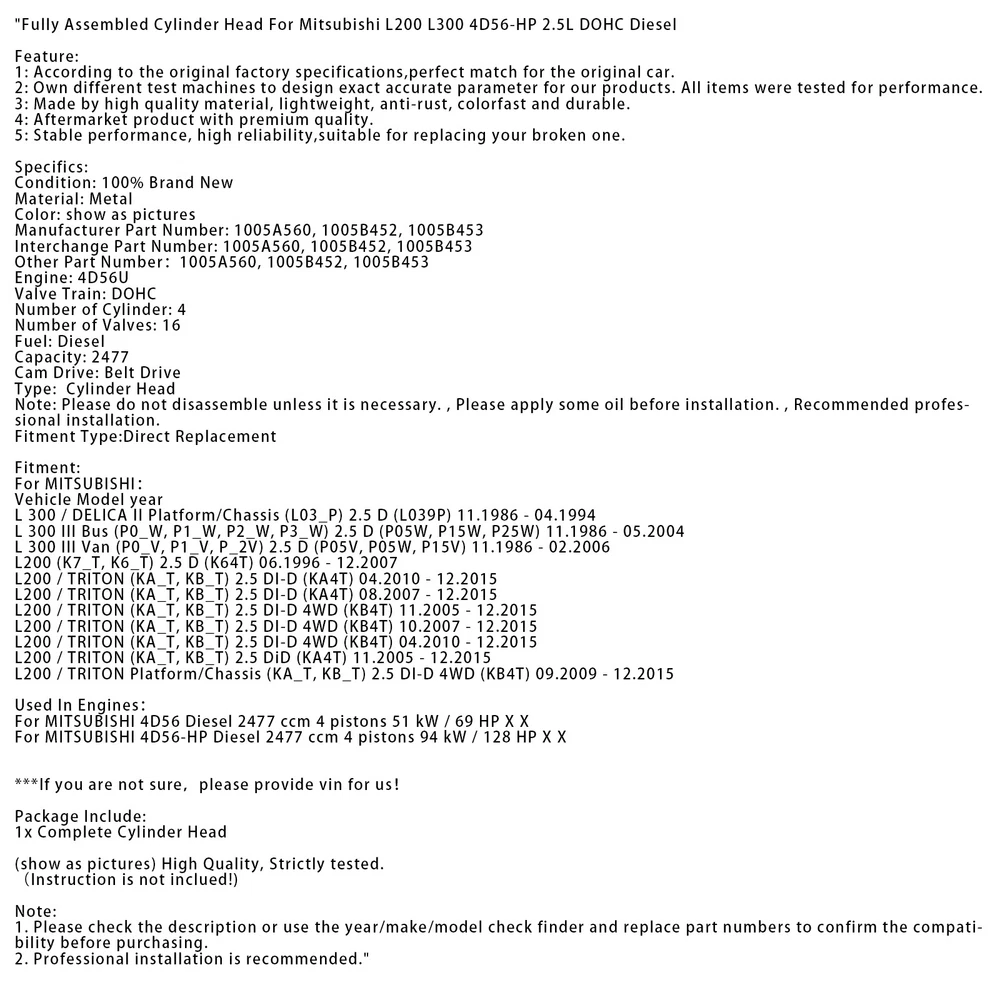 You may also like Cylinder Head WE Assembled 908749 For Ford Ranger PJ PK Mazda BT50 1061.85 USD Free shipping Cylinder Head Assembly Crankshaft For AUDI A4 A5 A6 Q5 2.0 DOHC TFSI (EA888) 799.85 USD Free shipping Bare Cylinder Head 403 / 117 For Jeep 2.5L 1989-2002 259.85 USD Free shipping 18mm Cylinder Head Stud Kit&Head Gasket For Ford 6.0L V8 Diesel 2003-2007 202.85 USD Free shipping Cylinder Head CM5G6C032CB For FOCUS 2015-2018 1.0L (Turbo) CM5Z-6049-E 773.85 USD Free shipping Complete Engine Cylinder Head Assembly Crankshaft +Gasket Kit For Audi A4 Q5 999.85 USD Free shipping Cylinder Head 20mm For Ford F-250 F-350 F-450 F550 6.0L Powerstroke Diesel 06-07 365.85 USD Free shipping Cylinder Head Assembly 06D103351D For Audi A4 A6 VW Jetta Golf Passat Seat Skoda 1229.85 USD Free shipping F16D3 Complete Cylinder Head Assembly For GM Chevy AVEO 1.6 2004-2007 DOHC 16V 440.85 USD Free shipping Fully Assembled Cylinder Head For Mitsubishi L200 L300 4D56-HP 2.5L DOHC Diesel Feature: 1: According to the original factory specifications,perfect match for the original car. 2: Own different test machines to design exact accurate parameter for our products.All items were tested for performance. 3: Made by high quality material, lightweight, anti-rust, colorfast and durable. 4: Aftermarket product with premium quality. 5: Stable performance, high reliability,suitable for replacing your broken one. Specifics: Condition: 100% Brand New Material: Metal Color: show as pictures Manufacturer Part Number: 1005A560, 1005B452, 1005B453 Interchange Part Number: 1005A560, 1005B452, 1005B453 Other Part Number:1005A560, 1005B452, 1005B453 Engine: 4D56U Valve Train: DOHC Number of Cylinder: 4 Number of Valves: 16 Fuel: Diesel Capacity: 2477 Cam Drive: Belt Drive Type: Cylinder Head Note: Please do not disassemble unless it is necessary., Please apply some oil before installation., Recommended professional installation. Fitment Type:Direct Replacement Fitment: For MITSUBISHI: Vehicle Model year L 300 / DELICA II Platform/Chassis (L03_P) 2.5 D (L039P) 11.1986 - 04.1994 L 300 III Bus (P0_W, P1_W, P2_W, P3_W) 2.5 D (P05W, P15W, P25W) 11.1986 - 05.2004 L 300 III Van (P0_V, P1_V, P_2V) 2.5 D (P05V, P05W, P15V) 11.1986 - 02.2006 L200 (K7_T, K6_T) 2.5 D (K64T) 06.1996 - 12.2007 L200 / TRITON (KA_T, KB_T) 2.5 DI-D (KA4T) 04.2010 - 12.2015 L200 / TRITON (KA_T, KB_T) 2.5 DI-D (KA4T) 08.2007 - 12.2015 L200 / TRITON (KA_T, KB_T) 2.5 DI-D 4WD (KB4T) 11.2005 - 12.2015 L200 / TRITON (KA_T, KB_T) 2.5 DI-D 4WD (KB4T) 10.2007 - 12.2015 L200 / TRITON (KA_T, KB_T) 2.5 DI-D 4WD (KB4T) 04.2010 - 12.2015 L200 / TRITON (KA_T, KB_T) 2.5 DiD (KA4T) 11.2005 - 12.2015 L200 / TRITON Platform/Chassis (KA_T, KB_T) 2.5 DI-D 4WD (KB4T) 09.2009 - 12.2015 Used In Engines: For MITSUBISHI 4D56 Diesel 2477 ccm 4 pistons 51 kW / 69 HP X X For MITSUBISHI 4D56-HP Diesel 2477 ccm 4 pistons 94 kW / 128 HP X X ***If you are not sure,please provide vin for us! Package Include: 1x Complete Cylinder Head (show as pictures) High Quality, Strictly tested. (Instruction is not inclued!) Note: 1.Please check the description or use the year/make/model check finder and replace part numbers to confirm the compatibility before purchasing. 2.Professional installation is recommended. -About US Founded in 2012, VIPJQ have professional development and sales, and are involved in various products, providing customers with various high-quality products. Since its establishment, VIPJQ has always adhered to the service concept of "customer first" and the management concept of "pursuit of quality", and is committed to providing customers with high-quality original designs. We commit to provide you the best innovative, quality products & professional services with competitive prices. We value every customer, and we look forward to providing solutions for your business needs to help your business achieve its goals, please contact us immediately! We are all about you! We are a Japanese seller,but with large warehouse in USA. We are profesional on Auto Parts,Car Parts,Motorcycle Parts,3C,other hot sale items and so on. We aim to provide to customers high quality product and best service. -About Shipment&Returns The item usually will be dispatched within 3 days after you ordered.All are free shipping. And it usually takes 3-10 working days to delivery depends on buyers' address or other majeure on the way. If you are not satisfied with the items and want to return the item,we hope you could message us first,we will give you the return details, we think we could give you the best service to save your time and money.Thank you. -About Feedback&Customer Service If you are enjoy your shopping here,not only enjoy the items but also the service,we are appreciate you could give us a 5-star feedback. If you are not satisfied with the item,before you give us the negative feedback,we hope we could give you the best solution through our commutication. We think we could do it if you give us the chance.Thank you.
