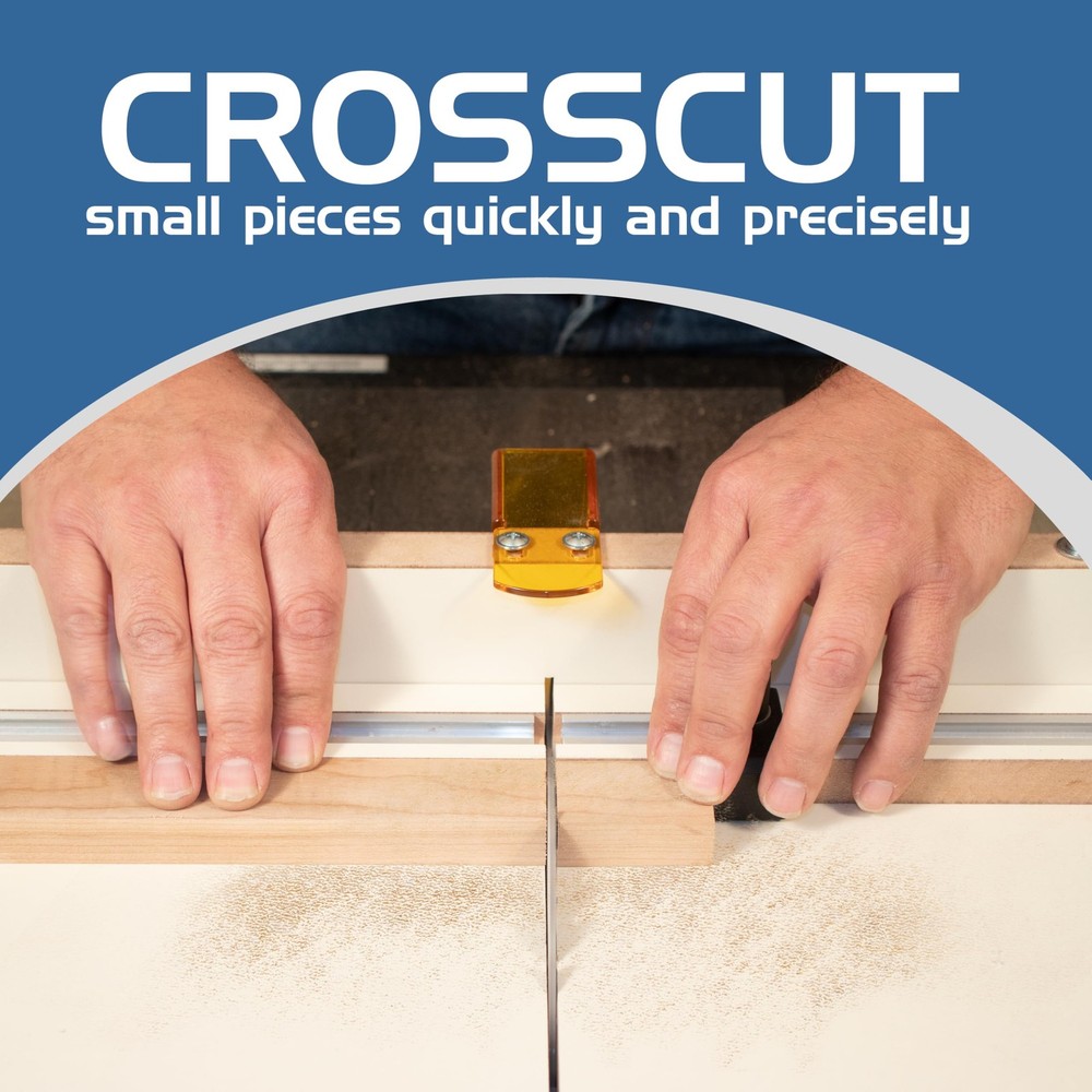 If you own a table saw, you probably have come across a situation or two where you need to make smaller cuts or make cross cuts. You may also have had the need to make repetitive cuts of the same length. Making small cuts, cross cuts and repetitive length cuts is where table saw crosscut sleds excel. Crosscut sleds help stabilize the work piece and are very accurate since they are essentially calibrated to your saw during the sled building process. Cross-cutting small pieces can be challenging and sometimes a bit dangerous. We can use a standard miter gauge, but that will typically let the cut off piece loose and it can fly off the table or into the saw blade opening. In steps our Table Saw Cross Cutting Sled with Stop Block and Adjustable Rails. This little sled makes cutting off small pieces a breeze. PRECISION & STABILITY - If you own a table saw, you likely need to make smaller cuts or repetitive cuts. A crosscut sled for a table saw enhances precision and stability, ensuring accurate cuts. Our tablesaw sled can make small and cross cuts easier, assisting with consistent length cuts during your projects. ADJUSTABLE RAILS - Comes complete with a stop block and adjustable rails. The adjustable aluminum tracks fit most table saws with standard 3/4” x 3/8” miter slots. This table saw crosscut sled kit ensures precision, making small cuts not only effortless, but also safe. ❗ DOES NOT FIT RYOBI TABLE SAW SLOTS ❗ COMPOSITE STOP BLOCK - The crosscut table saw sled kit features a composite stop block that won't damage the saw blade upon contact. It can be positioned on either side of the sled, making it perfect for achieving consistent cut lengths repeatedly. The sled measures approximately 18” long by 16” wide. CROSSCUT PANELS UP TO 13-1/2" WIDE - This cross cut sled for a table saw can handle both small pieces and panels up to 13-1/2" wide, delivering straight line crosscuts that miter saws can't achieve. It's the ideal crosscut sled kit for a variety of projects, providing a reliable mid-length crosscut solution. MEASURE YOUR SLOTS BEFORE ORDERING - Features adjustable aluminum tracks that fit most table saws with standard 3/4” x 3/8” miter slots. Please note that these tracks are incompatible with Ryobi and some other models. Measure your slots before ordering to ensure a proper fit for your table saw. ❗ DOES NOT FIT RYOBI TABLE SAW SLOTS ❗