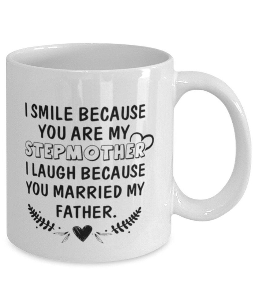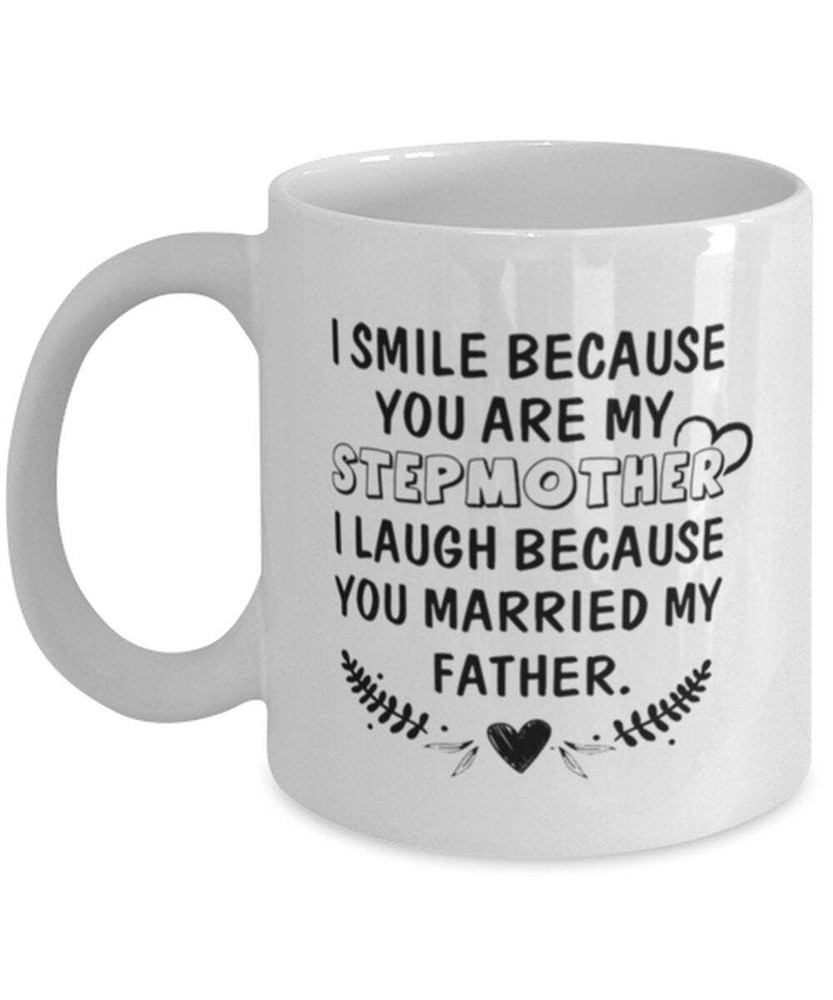 Stepmother Funny Coffee Mug I Smile You Are My Stepmother I Laugh You Married Product Details.. This high quality 11oz. ceramic white mug has a premium hard coat that provides crisp and vibrant color reproduction sure to last for years. Perfect for all hot & cold beverages. The highest quality printing possible is used. It will never fade no matter how many times you wash it. Material: 100% Ceramic. Print both sides. Dishwasher and Microwave Safe. High Gloss + Premium White Finish. Printed in the U.S.A. Personalized & Custom. We support personalized and custom mug to add custom, when placing an order, you can add notes to the "order note" in shipping address section. Also you can contact us directly via message. Shipping Info. Ready to ship in 1 to 2 business days, All products are made-to-order and proudly printed in the United States. Shipped by USPS and DHL, You will receive your order in 5-7 days. Replace & Refund. All products are defective during shipping broken, chipped will be replaced free of charge. You are not satisfied with the product, we will refund 100% money to you. If any other issues arise, please do not hesitate to message, we would be more than happy to assist you.
