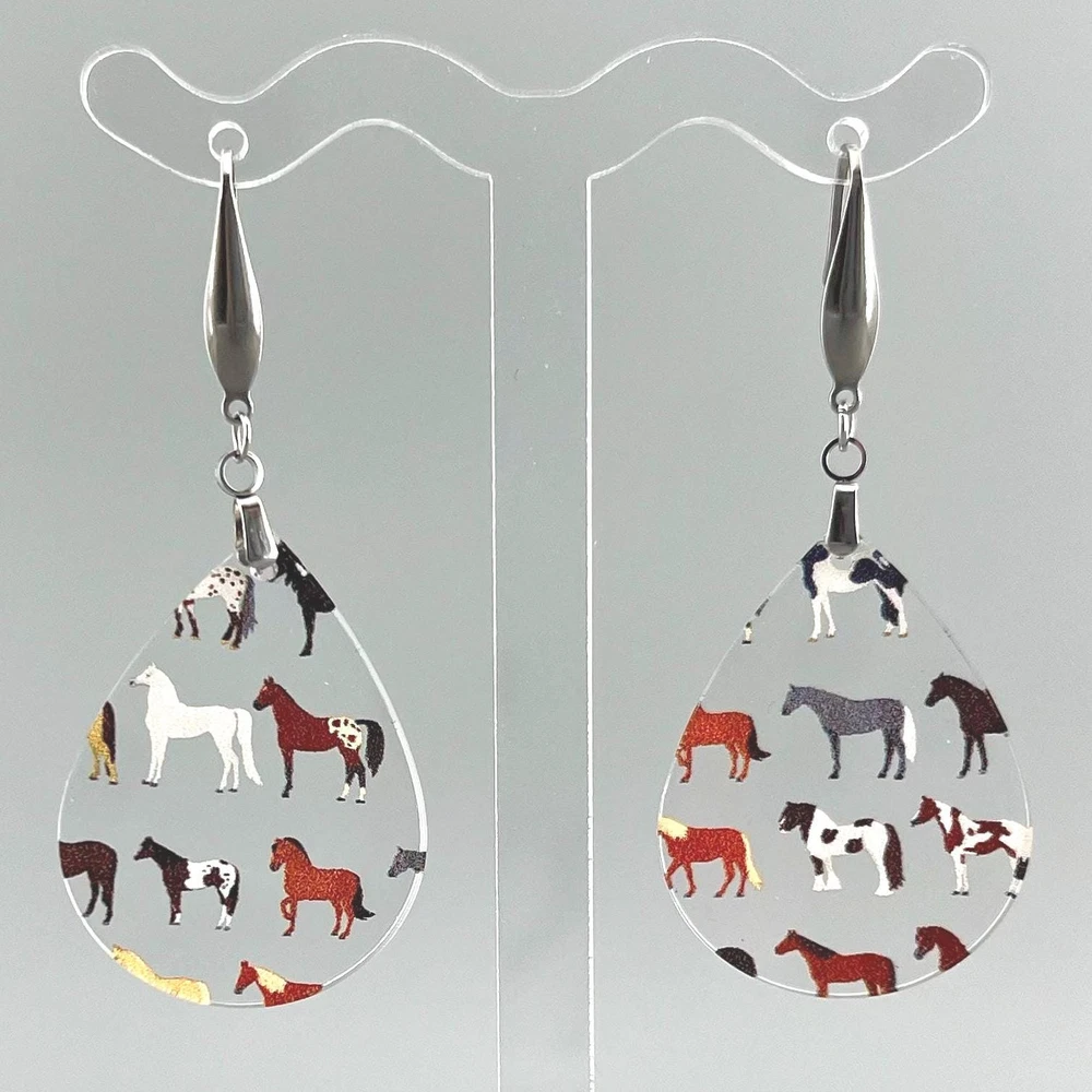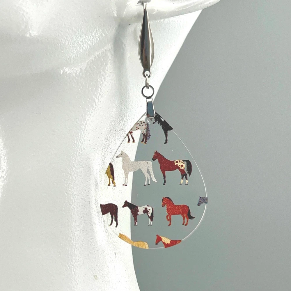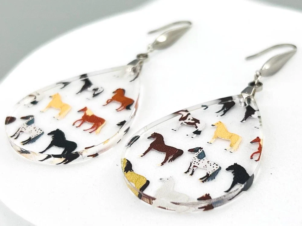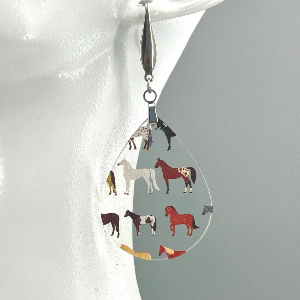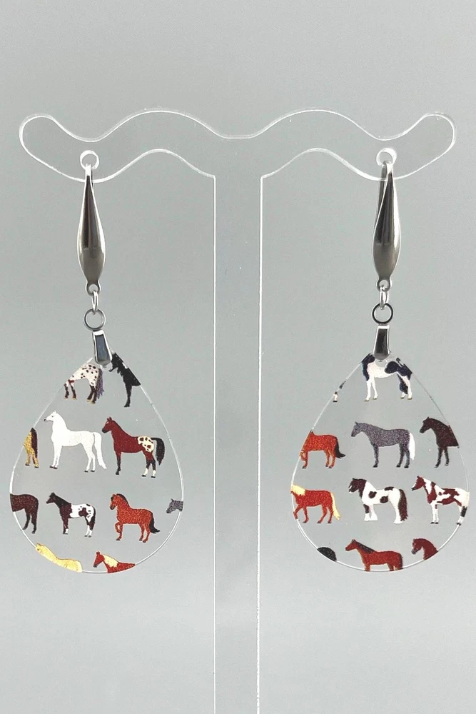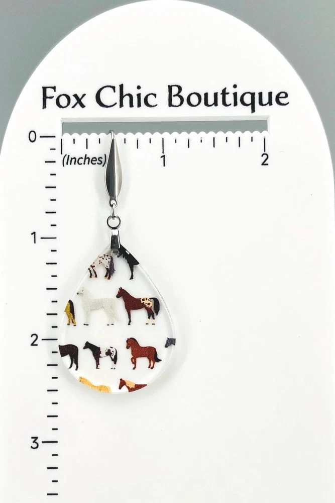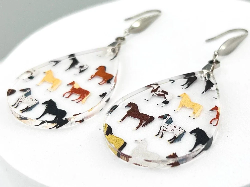 Add a touch of country charm to your look with these fun horse earrings! Perfect for the equestrian or horse lover in your life, these animal earrings will make a great gift for her. Whether you're heading to the rodeo or simply embracing your inner country girl, these unique horse jewelry pieces are sure to impress. Lightweight Acrylic Earrings on a Stainless Steel hook. Earring hardware is stainless steel and nickel/lead free. 🌟(Please see item details/highlights/pictures for size information)🌟 Each earring is laser cut from acrylic and assembled by hand in our studio. 🌟Due to variation in the patterns and handmade processes, each earring will vary earring to earring. No two earrings will be identical but will look similar to what is pictured! Each pair of earrings comes on an earring card with silicone backers and packaged in an organza bag. Perfect for gift giving! We currently do not offer more gift-wrapping options. Shipping: All purchases are shipped in a box with tracking so that they arrive safely to you! Currently we only ship to US postal addresses. We have a set standard shipping time of 1-3 business days from the time your order is placed. Everything in our shop is already handmade and ready to ship FAST! Please be aware that unexpected delays can occur, which you will be notified at the time of any such occurrence. Jewelry Care: 🌟Each piece is delicate! Avoid dropping or bending! 🌟Do Not expose to excessive moisture, please remove jewelry before showering, swimming, and sleeping. 🌟Avoid abrasives, perfumes, lotions, excessive heat, chemicals etc. These may deteriorate your jewelry and may damage its appearance. 🌟Clean with the soft cloth we have included in your package (and it is FREE of Charge!) No Returns: Due to hygienic and safety reasons, ALL SALES ARE FINAL. We DO NOT accept returns. In the event you have an issue with your purchase, please feel free to message us on Etsy to discuss any possible resolution.