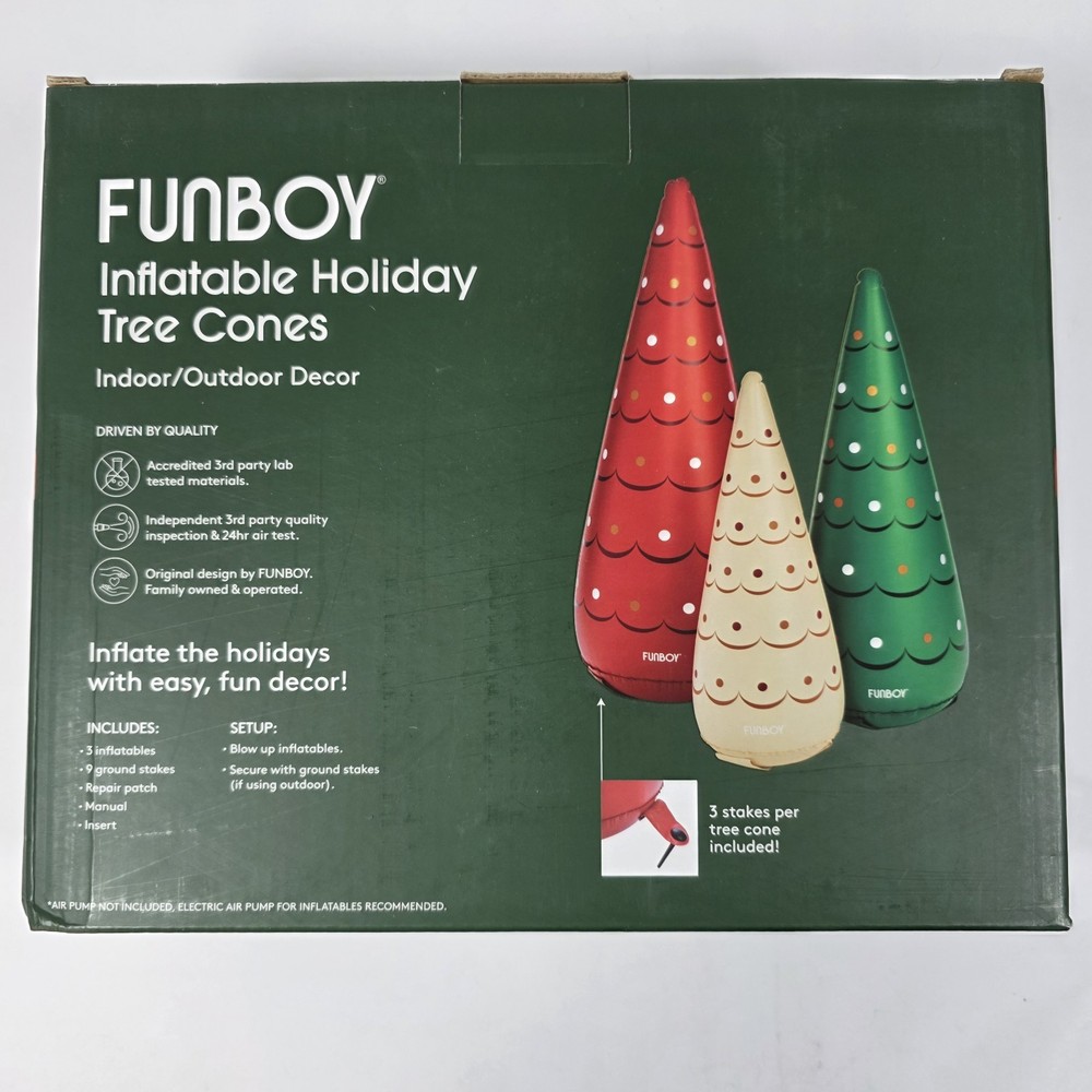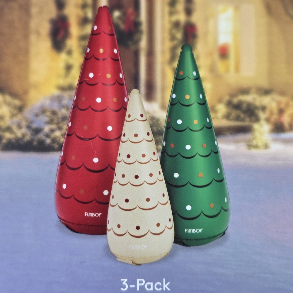 The Funboy Inflatable Holiday Tree Cones are a festive and colorful addition to your indoor or outdoor Christmas decorations. Made of durable plastic, these free-standing tree cones come in a 3-pack, including sizes large, medium, and small. They are designed for easy setup and storage, simply inflate with an electric pump (not included) and deflate when the season is over. The inflatable design, along with weighted bases and included ground stakes, ensures that these traditional style Christmas characters stay put and add a touch of holiday cheer to any room.