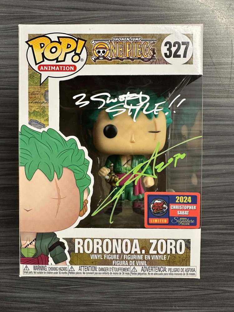 Funko POP! Animation: Shonen Jump One Piece - Roronoa. Zoro [2021] (2024 Cloud Zero)(Signed/Christopher Sabat/JSA)(Damaged Box) #327 Signed By Christopher Sabat "3 Sword Style !!" JSA Authenticated -Window Display Box -3 3/4 inches tall -Ages 3+ Funko POP! Animation: Shonen Jump One Piece - Roronoa. Zoro [2021] (2024 Cloud Zero)(Signed/Christopher Sabat/JSA)(Damaged Box) #327 Signed By Christopher Sabat "3 Sword Style !!" JSA Authenticated -Window Display Box -3 3/4 inches tall -Ages 3+ × × × × × × × × × × Buy now and save! Tell a friend Visit store Watch now Postage info Click the Postage tab above the listing description for more info Price: $10.00 (local shipping) Click the Postage tab above the listing description for more info! Additional delivery notes PICK UP OPTION Sorry, our items are NOT available for pick-up. PAYING VIA PAYPAL We accept PayPal on our all our items so you can shop with confidence. Simple choose the PayPal option when proceeding through the checkout. Additional Information No additional information at this time Ask seller a question Contact To contact our Customer Service Team, simply click the button here and our Customer Service team will be happy to assist. Ask seller a question © The Pop Plug Postage Shipping is a flat rate across US at a rate of $10.00 Payment Accepted Payment Methods PayPal Returns Returns are not accepted Buyer will pay for return shipping. eBay integration by