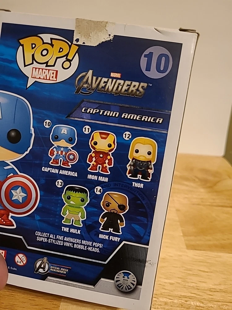 This Funko Pop! vinyl bobblehead features Captain America from Marvel's The Avengers franchise. The figure is made of high-quality vinyl material and comes in a classic blue color. It is part of the Pop! Vinyl product line and has a box number of 10. This particular model is from the 2012 release year and has the model number #10. In addition to being a great collectible for fans of the Marvel movies, this Funko Pop! comes with a hard stack to ensure it stays in pristine condition. Minor box damage. With its vaulted status, this bobblehead is sure to be a valuable addition to any Marvel or Funko collection.