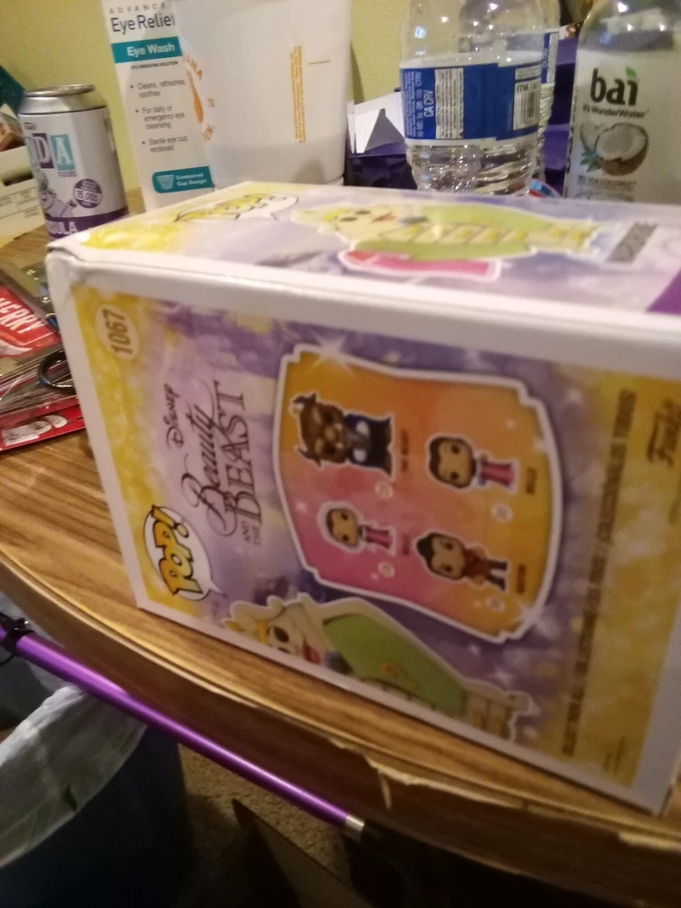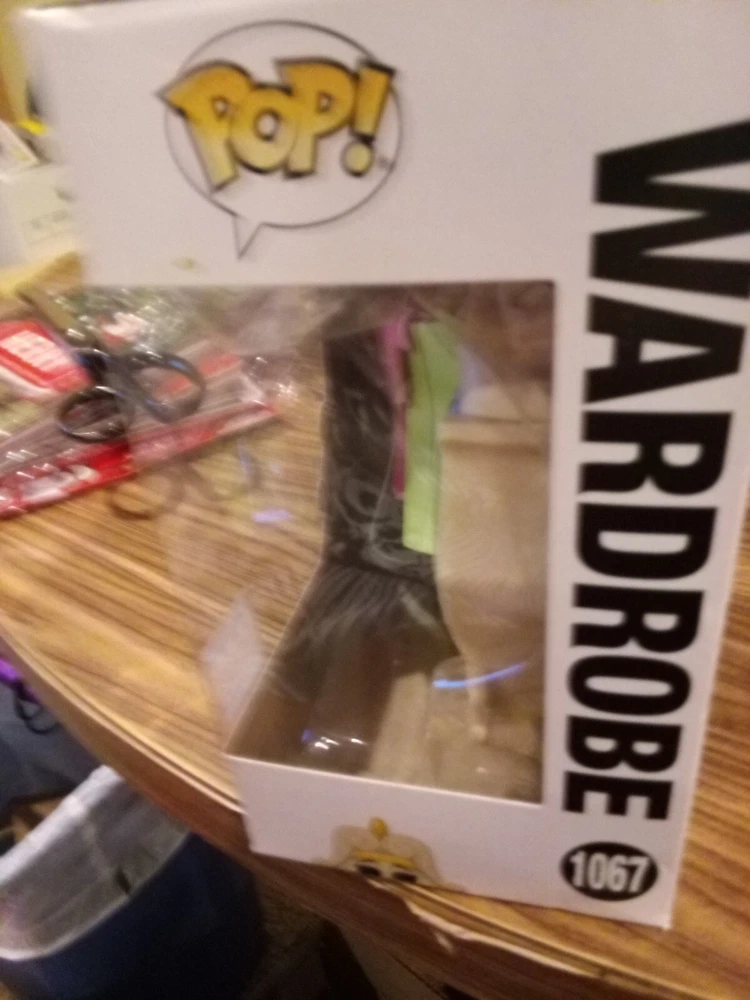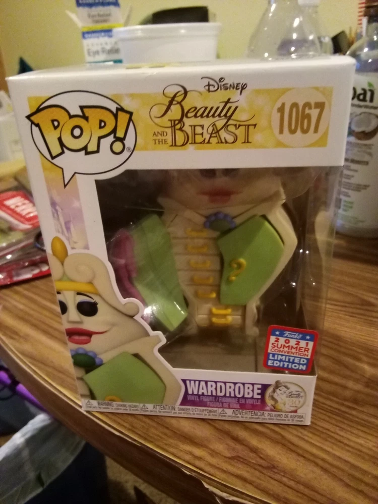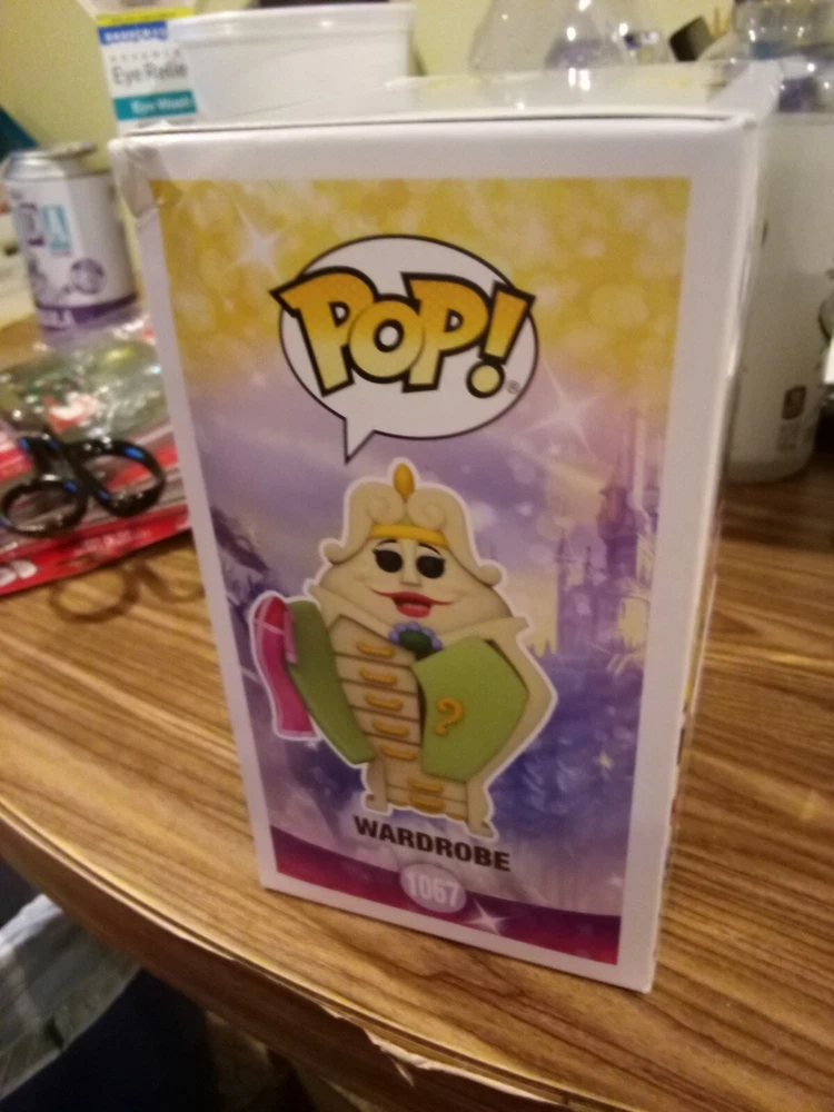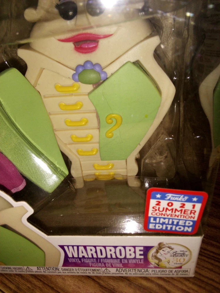 Introducing the Funko Pop! Vinyl figure of Wardrobe from Disney's animated movies. This highly collectible figure is part of the exclusive 2021 SDCC/Funkon series and comes in a beautifully designed box with the box number 1067. The figure is made of high-quality vinyl material and features a vaulted design, making it a must-have for any Disney or Funko collector. This Pop! Vinyl figure is perfect for fans of Disney's animated movies and comics. It is an exclusive product from Box Lunch and San Diego Comic Con, making it a rare find. Add this highly sought-after figure to your collection today and complete your wardrobe of Disney and Funko collectibles. Nick on one side of the box😕