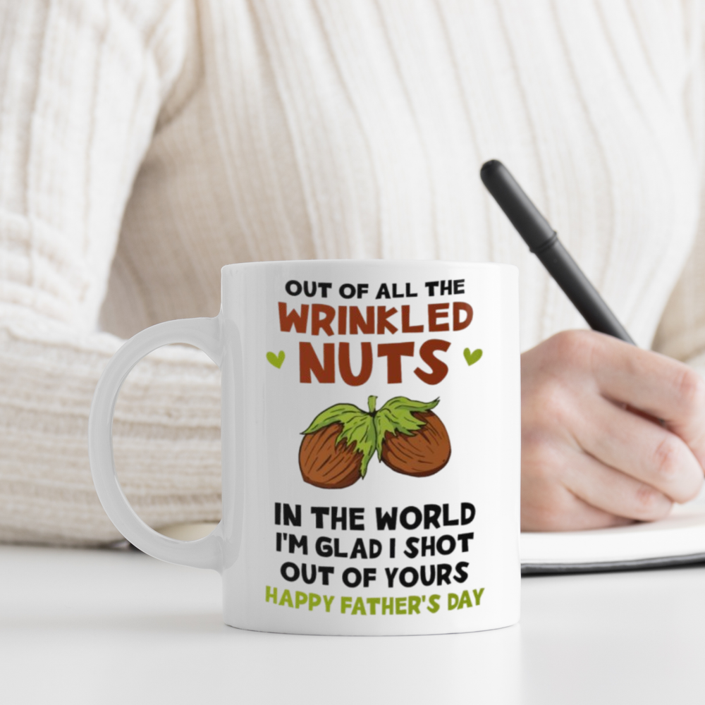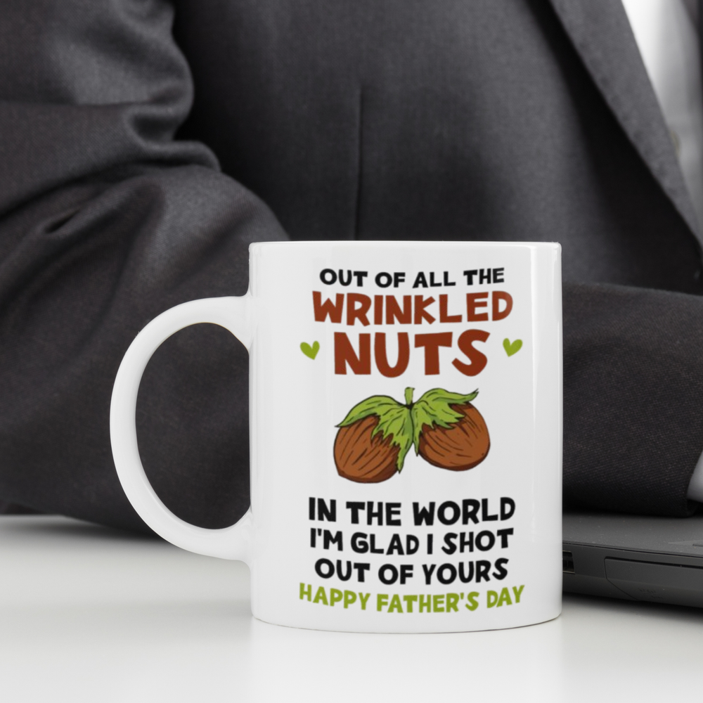 🎁 A FUNNY AND HEARTFELT GIFT FOR DAD: This 11oz white ceramic mug features the humorous message: "Out of all the wrinkled nuts in the world, I'm glad I shot out of yours." A hilarious and unique way to wish Dad a Happy Father’s Day while showing him how much you appreciate his love and care. ☕ FEATURES: Material: High-quality white ceramic Capacity: 11 oz Microwave and dishwasher safe Clear and vibrant text design ✨ WHY THIS MUG IS PERFECT: Ideal for Father’s Day, birthdays, or any occasion Durable and lightweight, perfect for everyday use A great way to show Dad you care with humor 📦 PACKAGING: Securely packaged to ensure safe delivery Ready for gifting and guaranteed to make Dad smile