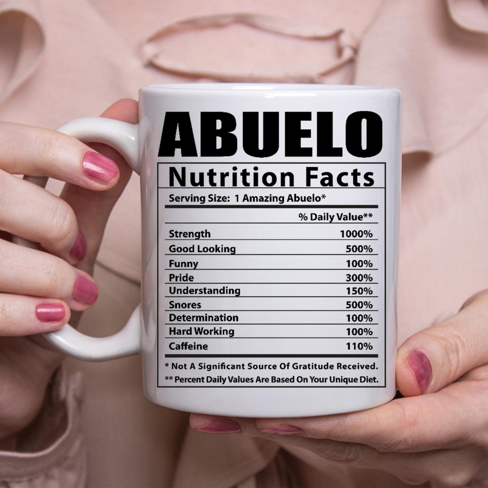 Funny Abuelo Gifts Nutritional Facts White Coffee Mug Product Details.. This high quality 11oz. ceramic white mug has a premium hard coat that provides crisp and vibrant color reproduction sure to last for years. Perfect for all hot & cold beverages. The highest quality printing possible is used. It will never fade no matter how many times you wash it. Material: 100% Ceramic. Print both sides. Dishwasher and Microwave Safe. High Gloss + Premium White Finish. Printed in the U.S.A. Personalized & Custom. We support personalized and custom mug to add custom, when placing an order, you can add notes to the "order note" in shipping address section. Also you can contact us directly via message. Shipping Info. Ready to ship in 1 to 2 business days, All products are made-to-order and proudly printed in the United States. Shipped by USPS and DHL, You will receive your order in 5-7 days. Replace & Refund. All products are defective during shipping broken, chipped will be replaced free of charge. You are not satisfied with the product, we will refund 100% money to you. If any other issues arise, please do not hesitate to message, we would be more than happy to assist you.