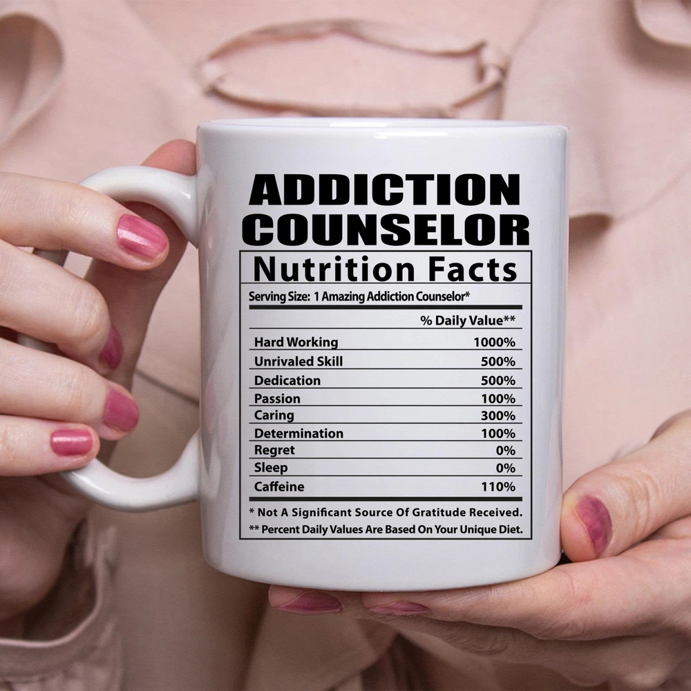 Funny Addiction Counselor Nutritional Facts White Coffee Mug Product Details.. This high quality 11oz. ceramic white mug has a premium hard coat that provides crisp and vibrant color reproduction sure to last for years. Perfect for all hot & cold beverages. The highest quality printing possible is used. It will never fade no matter how many times you wash it. Material: 100% Ceramic. Print both sides. Dishwasher and Microwave Safe. High Gloss + Premium White Finish. Printed in the U.S.A. Personalized & Custom. We support personalized and custom mug to add custom, when placing an order, you can add notes to the "order note" in shipping address section. Also you can contact us directly via message. Shipping Info. Ready to ship in 1 to 2 business days, All products are made-to-order and proudly printed in the United States. Shipped by USPS and DHL, You will receive your order in 5-7 days. Replace & Refund. All products are defective during shipping broken, chipped will be replaced free of charge. You are not satisfied with the product, we will refund 100% money to you. If any other issues arise, please do not hesitate to message, we would be more than happy to assist you.