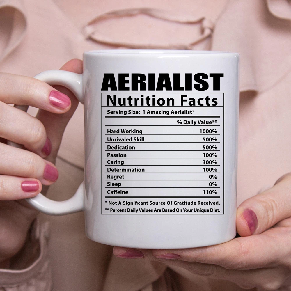 Funny Aerialist Nutritional Facts White Coffee Mug Product Details.. This high quality 11oz. ceramic white mug has a premium hard coat that provides crisp and vibrant color reproduction sure to last for years. Perfect for all hot & cold beverages. The highest quality printing possible is used. It will never fade no matter how many times you wash it. Material: 100% Ceramic. Print both sides. Dishwasher and Microwave Safe. High Gloss + Premium White Finish. Printed in the U.S.A. Personalized & Custom. We support personalized and custom mug to add custom, when placing an order, you can add notes to the "order note" in shipping address section. Also you can contact us directly via message. Shipping Info. Ready to ship in 1 to 2 business days, All products are made-to-order and proudly printed in the United States. Shipped by USPS and DHL, You will receive your order in 5-7 days. Replace & Refund. All products are defective during shipping broken, chipped will be replaced free of charge. You are not satisfied with the product, we will refund 100% money to you. If any other issues arise, please do not hesitate to message, we would be more than happy to assist you.