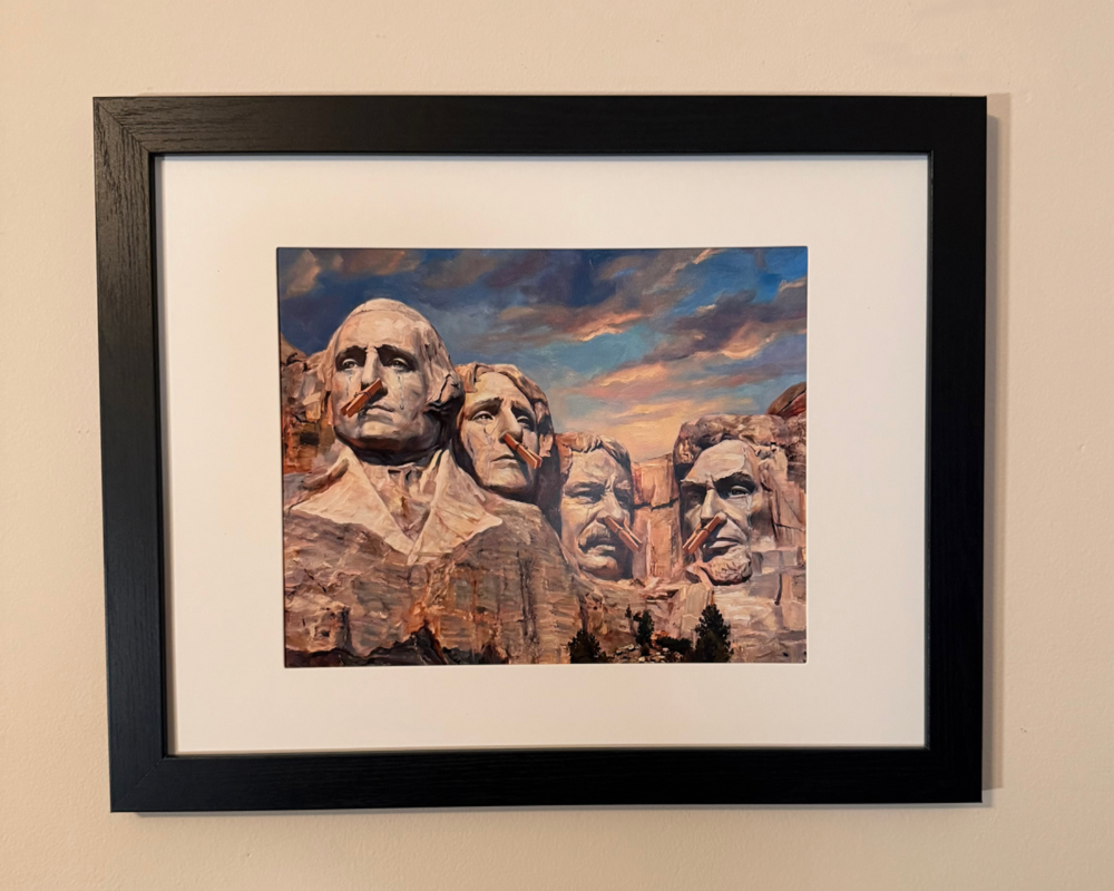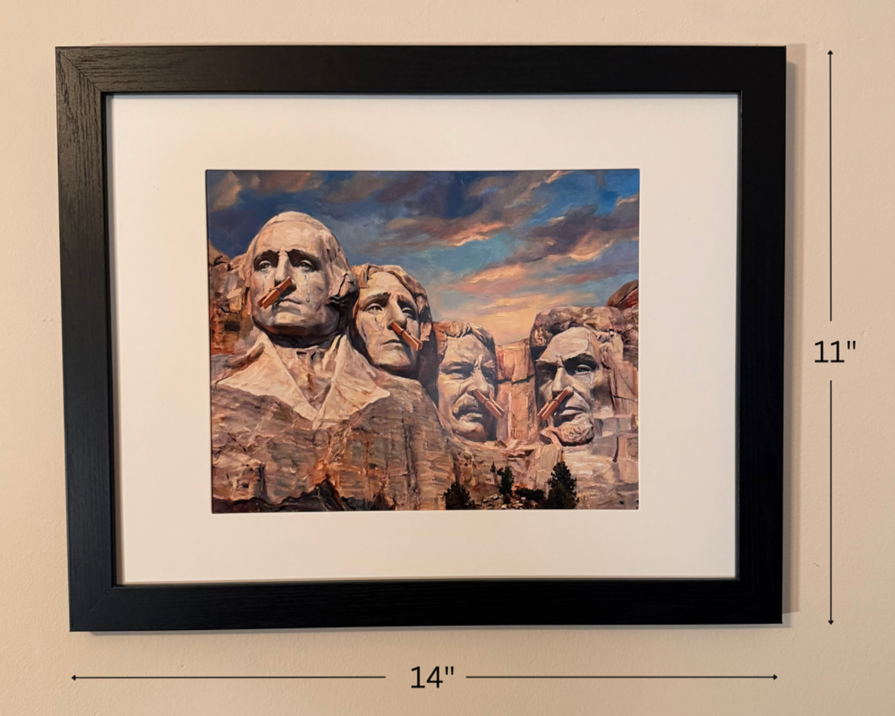 Funny Bathroom Wall Hanging, Mt Rushmore with the iconic American Presidents wearing clothespins on their noses. This is a unique, original print 8x10" in full color with off-white matte and 11x14" black wood frame and real glass pane. Get a genuine laugh with every visit to your guest bathroom, or any bathroom in your home or work. Packed in generous padding and rigid cardboard box to ensure it arrives safely to your address.
