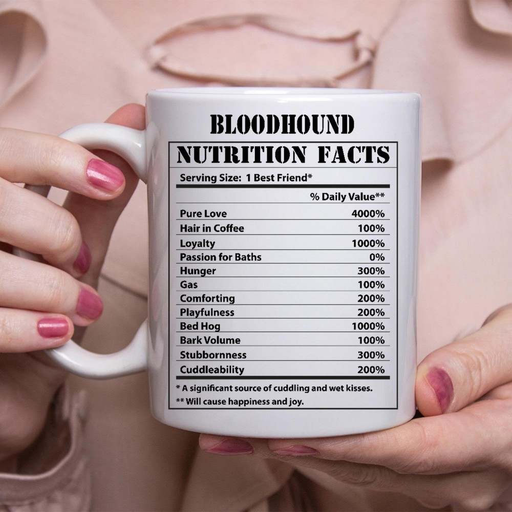 Funny Bloodhound Gifts Nutritional Facts White Coffee Mug Product Details.. This high quality 11oz. ceramic white mug has a premium hard coat that provides crisp and vibrant color reproduction sure to last for years. Perfect for all hot & cold beverages. The highest quality printing possible is used. It will never fade no matter how many times you wash it. Material: 100% Ceramic. Print both sides. Dishwasher and Microwave Safe. High Gloss + Premium White Finish. Printed in the U.S.A. Personalized & Custom. We support personalized and custom mug to add custom, when placing an order, you can add notes to the "order note" in shipping address section. Also you can contact us directly via message. Shipping Info. Ready to ship in 1 to 2 business days, All products are made-to-order and proudly printed in the United States. Shipped by USPS and DHL, You will receive your order in 5-7 days. Replace & Refund. All products are defective during shipping broken, chipped will be replaced free of charge. You are not satisfied with the product, we will refund 100% money to you. If any other issues arise, please do not hesitate to message, we would be more than happy to assist you.