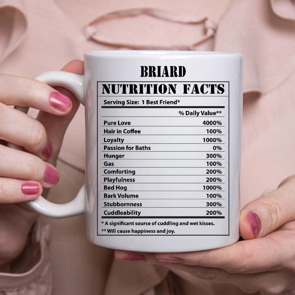 Funny Briard Gifts Nutritional Facts White Coffee Mug Product Details.. This high quality 11oz. ceramic white mug has a premium hard coat that provides crisp and vibrant color reproduction sure to last for years. Perfect for all hot & cold beverages. The highest quality printing possible is used. It will never fade no matter how many times you wash it. Material: 100% Ceramic. Print both sides. Dishwasher and Microwave Safe. High Gloss + Premium White Finish. Printed in the U.S.A. Personalized & Custom. We support personalized and custom mug to add custom, when placing an order, you can add notes to the "order note" in shipping address section. Also you can contact us directly via message. Shipping Info. Ready to ship in 1 to 2 business days, All products are made-to-order and proudly printed in the United States. Shipped by USPS and DHL, You will receive your order in 5-7 days. Replace & Refund. All products are defective during shipping broken, chipped will be replaced free of charge. You are not satisfied with the product, we will refund 100% money to you. If any other issues arise, please do not hesitate to message, we would be more than happy to assist you.