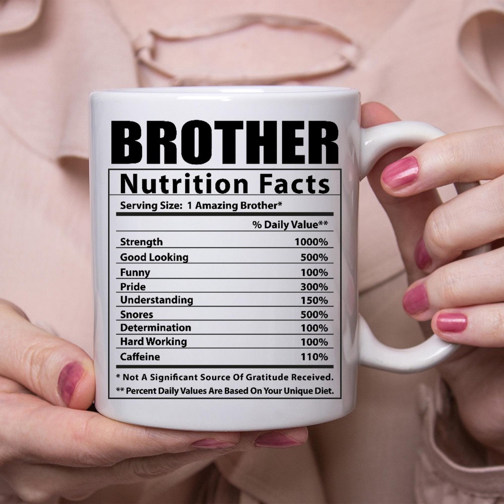 Funny Brother Gifts Nutritional Facts White Coffee Mug Product Details.. This high quality 11oz. ceramic white mug has a premium hard coat that provides crisp and vibrant color reproduction sure to last for years. Perfect for all hot & cold beverages. The highest quality printing possible is used. It will never fade no matter how many times you wash it. Material: 100% Ceramic. Print both sides. Dishwasher and Microwave Safe. High Gloss + Premium White Finish. Printed in the U.S.A. Personalized & Custom. We support personalized and custom mug to add custom, when placing an order, you can add notes to the "order note" in shipping address section. Also you can contact us directly via message. Shipping Info. Ready to ship in 1 to 2 business days, All products are made-to-order and proudly printed in the United States. Shipped by USPS and DHL, You will receive your order in 5-7 days. Replace & Refund. All products are defective during shipping broken, chipped will be replaced free of charge. You are not satisfied with the product, we will refund 100% money to you. If any other issues arise, please do not hesitate to message, we would be more than happy to assist you.