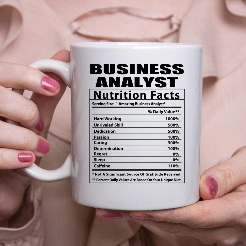 Funny Business Analyst Nutritional Facts White Coffee Mug Product Details.. This high quality 11oz. ceramic white mug has a premium hard coat that provides crisp and vibrant color reproduction sure to last for years. Perfect for all hot & cold beverages. The highest quality printing possible is used. It will never fade no matter how many times you wash it. Material: 100% Ceramic. Print both sides. Dishwasher and Microwave Safe. High Gloss + Premium White Finish. Printed in the U.S.A. Personalized & Custom. We support personalized and custom mug to add custom, when placing an order, you can add notes to the "order note" in shipping address section. Also you can contact us directly via message. Shipping Info. Ready to ship in 1 to 2 business days, All products are made-to-order and proudly printed in the United States. Shipped by USPS and DHL, You will receive your order in 5-7 days. Replace & Refund. All products are defective during shipping broken, chipped will be replaced free of charge. You are not satisfied with the product, we will refund 100% money to you. If any other issues arise, please do not hesitate to message, we would be more than happy to assist you.