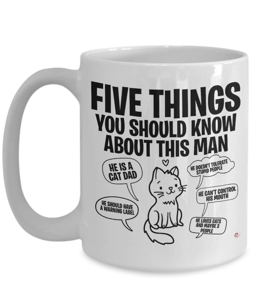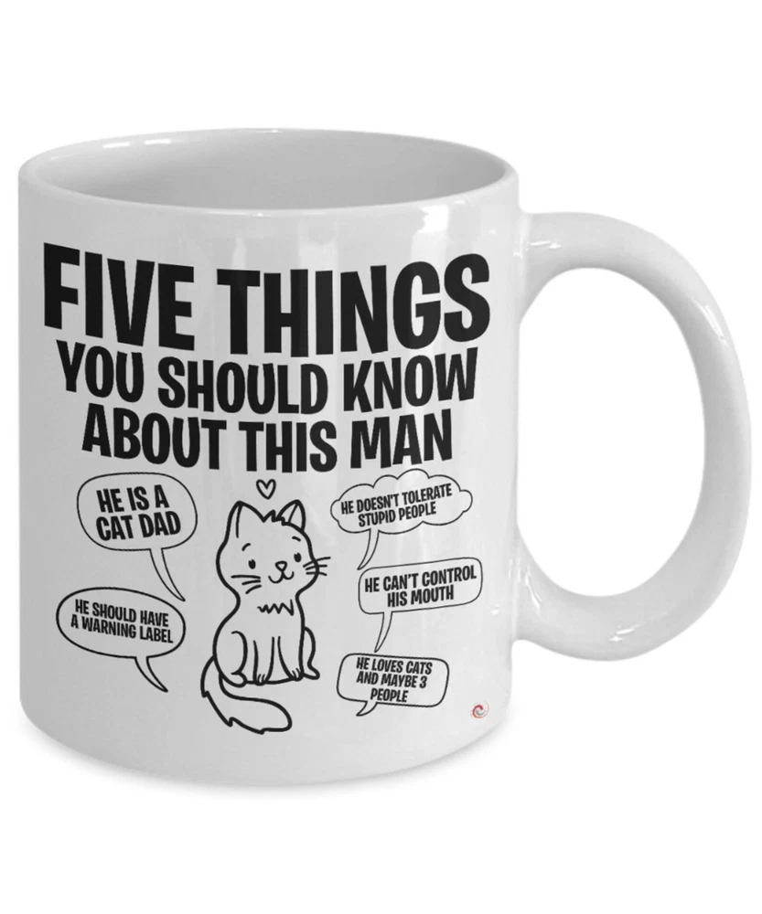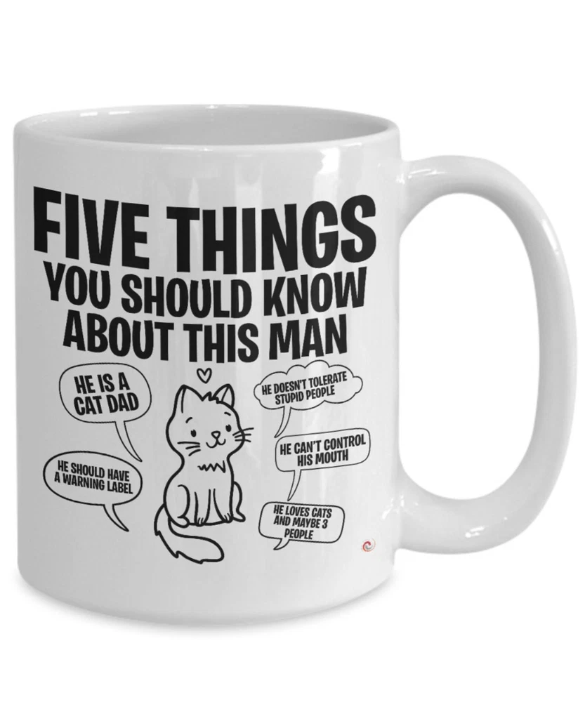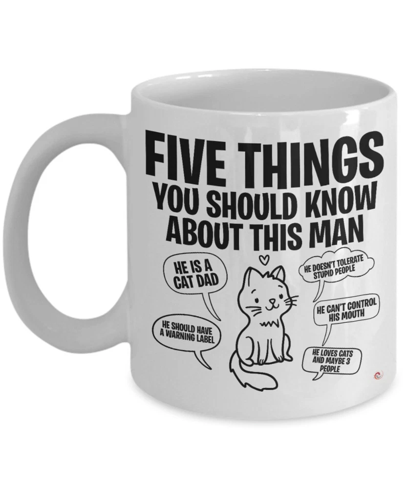 Funny Cat Dad Mug Five Things You Should Know About This Man Coffee Cup White Product Details.. This high quality 11oz. ceramic white mug has a premium hard coat that provides crisp and vibrant color reproduction sure to last for years. Perfect for all hot & cold beverages. The highest quality printing possible is used. It will never fade no matter how many times you wash it. Material: 100% Ceramic. Print both sides. Dishwasher and Microwave Safe. High Gloss + Premium White Finish. Printed in the U.S.A. Personalized & Custom. We support personalized and custom mug to add custom, when placing an order, you can add notes to the "order note" in shipping address section. Also you can contact us directly via message. Shipping Info. Ready to ship in 1 to 2 business days, All products are made-to-order and proudly printed in the United States. Shipped by USPS and DHL, You will receive your order in 5-7 days. Replace & Refund. All products are defective during shipping broken, chipped will be replaced free of charge. You are not satisfied with the product, we will refund 100% money to you. If any other issues arise, please do not hesitate to message, we would be more than happy to assist you.