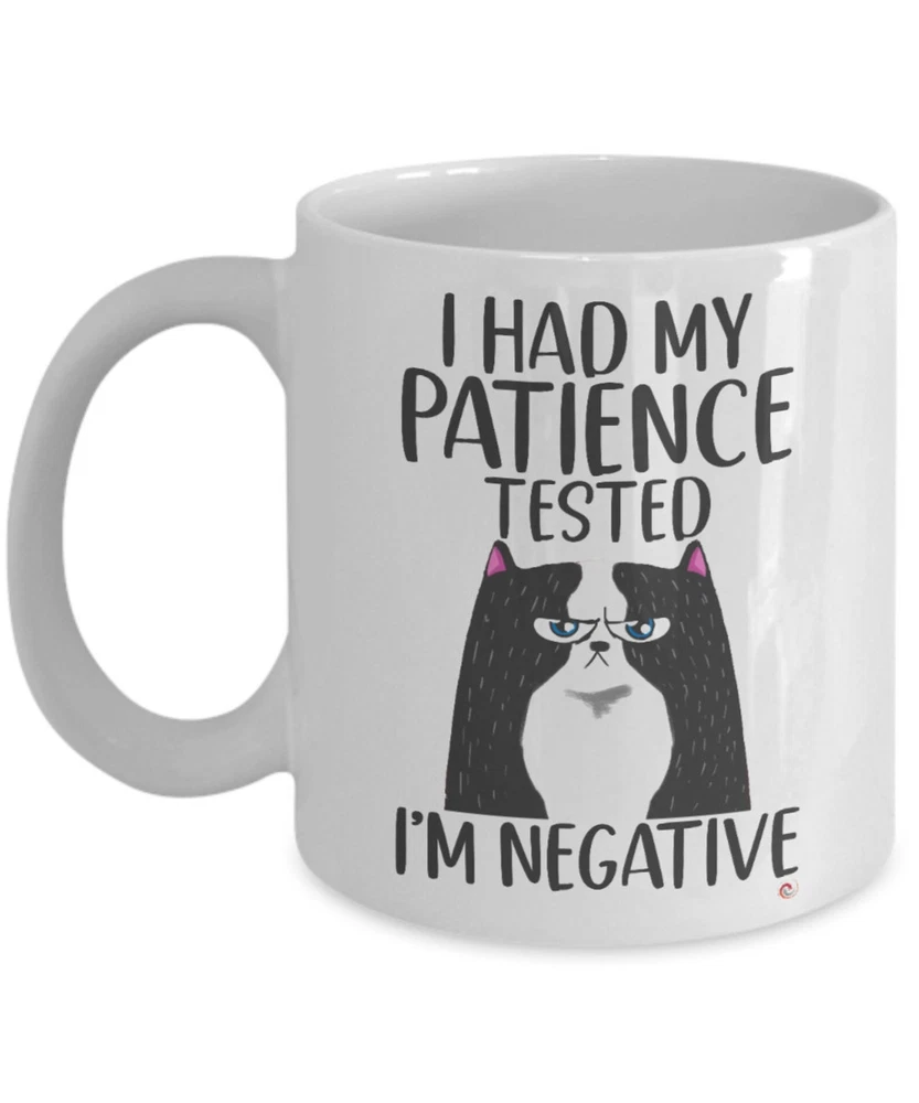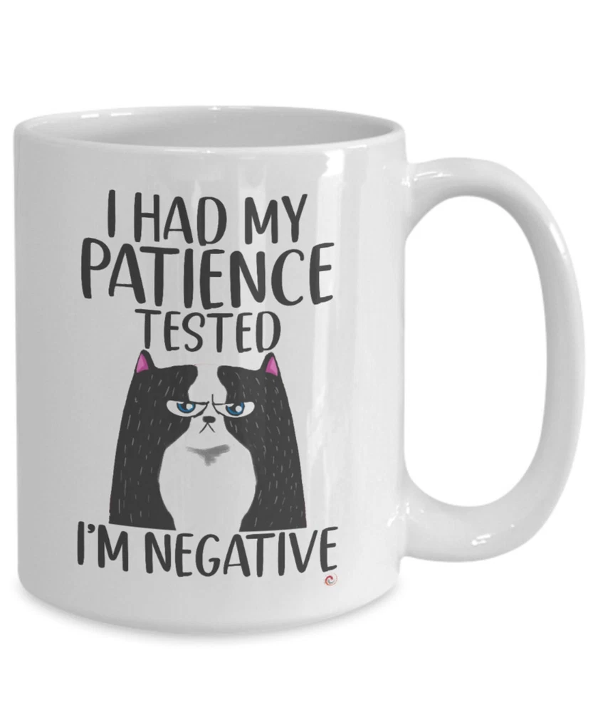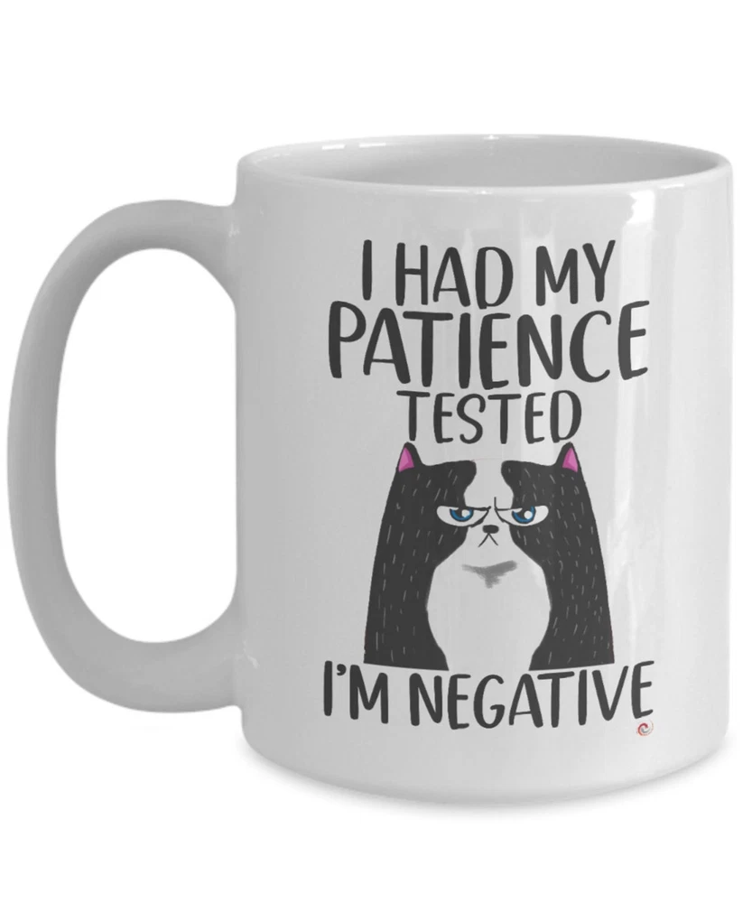 Funny Cat Mug I Had My Patience Tested I'm Negative Coffee Cup White Product Details.. This high quality 11oz. ceramic white mug has a premium hard coat that provides crisp and vibrant color reproduction sure to last for years. Perfect for all hot & cold beverages. The highest quality printing possible is used. It will never fade no matter how many times you wash it. Material: 100% Ceramic. Print both sides. Dishwasher and Microwave Safe. High Gloss + Premium White Finish. Printed in the U.S.A. Personalized & Custom. We support personalized and custom mug to add custom, when placing an order, you can add notes to the "order note" in shipping address section. Also you can contact us directly via message. Shipping Info. Ready to ship in 1 to 2 business days, All products are made-to-order and proudly printed in the United States. Shipped by USPS and DHL, You will receive your order in 5-7 days. Replace & Refund. All products are defective during shipping broken, chipped will be replaced free of charge. You are not satisfied with the product, we will refund 100% money to you. If any other issues arise, please do not hesitate to message, we would be more than happy to assist you.