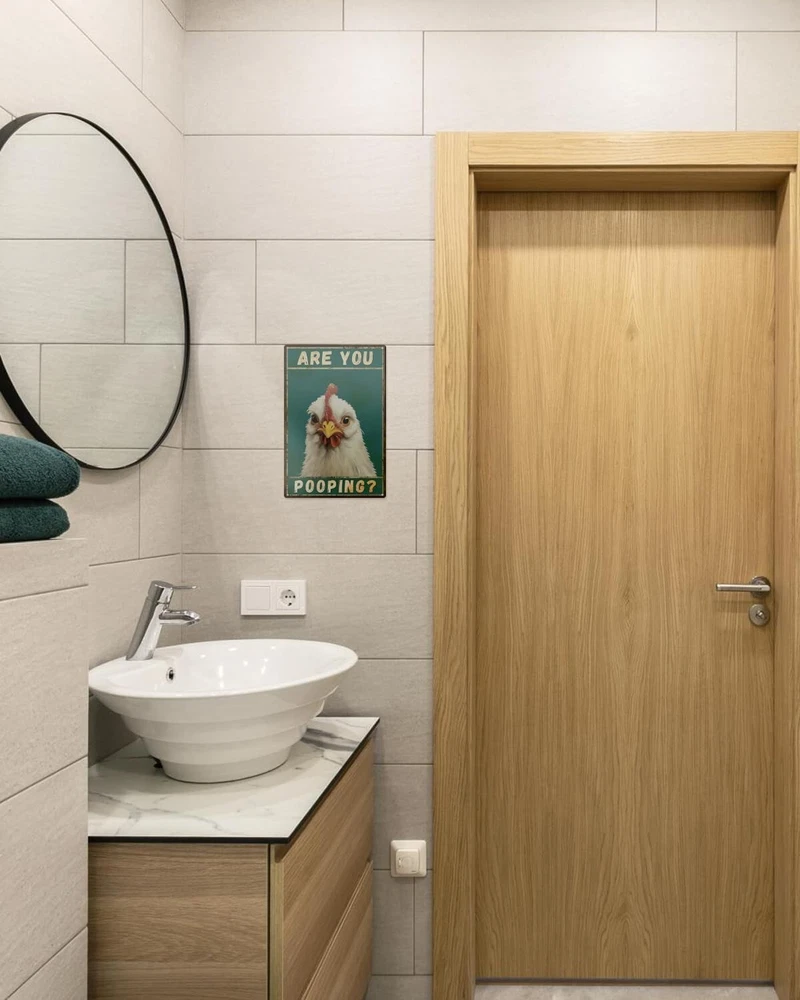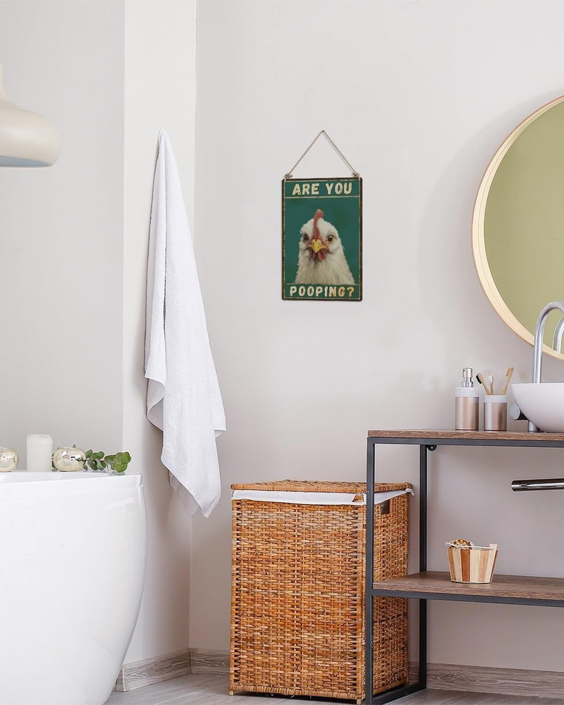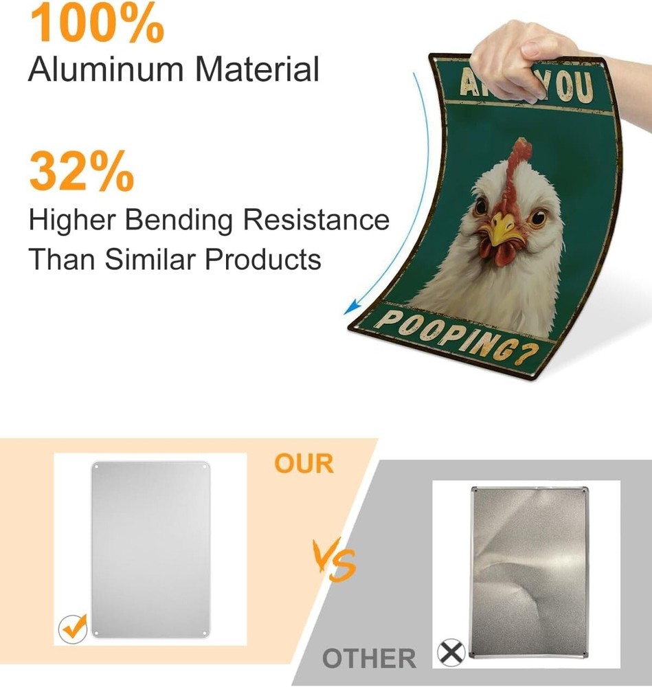 Funny Chicken Are You Pooping Metal Tin Sign for Farmhouse Bathroom Toilet Decor 【Constructed from 100% rust-free aluminum】With four pre-drilled holes in the rounded corners, it's easy to hang on walls or other surfaces, allowing for versatile indoor and outdoor display. 【Color Fastness】 The sign comes in bright, eye-catching colors that are designed not to fade over time. This means it will maintain its vibrant appearance even when exposed to outdoor conditions. 【Gift-Worthy】The chicken-themed sign makes for a perfect gift for friends, family, or loved ones. It can be used to decorate homes, offices, and bathrooms and is likely to bring joy and comfort to those who see it. 【Bathroom Wall Decor】The chicken wall art is designed with funny bathroom highland hen elements, that can help you express your bold style and unique artsy taste to add more funny to your space. 【Color Variations】 The note mentions that the color of the print may vary slightly from what you see on your screen due to different screen types, but the aim is to provide an accurate representation of the product.