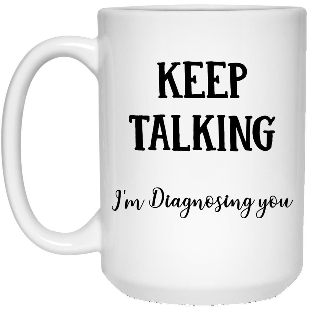 Coffee Mug Keep Talking. I'm Diagnosing You. Motivational Gift Inspirational Mug Product Details.. This high quality 11oz. ceramic white mug has a premium hard coat that provides crisp and vibrant color reproduction sure to last for years. Perfect for all hot & cold beverages. The highest quality printing possible is used. It will never fade no matter how many times you wash it. Material: 100% Ceramic. Print both sides. Dishwasher and Microwave Safe. High Gloss + Premium White Finish. Printed in the U.S.A. Personalized & Custom. We support personalized and custom mug to add custom, when placing an order, you can add notes to the "order note" in shipping address section. Also you can contact us directly via message. Shipping Info. Ready to ship in 1 to 2 business days, All products are made-to-order and proudly printed in the United States. Shipped by USPS and DHL, You will receive your order in 5-7 days. Replace & Refund. All products are defective during shipping broken, chipped will be replaced free of charge. You are not satisfied with the product, we will refund 100% money to you. If any other issues arise, please do not hesitate to message, we would be more than happy to assist you.