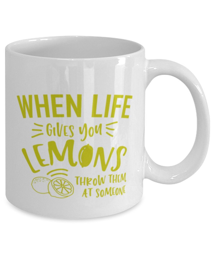 Funny Saying Coffee Mug When Life Gives You Lemons Throw Them At Someone Mug Product Details.. This high quality 11oz. ceramic white mug has a premium hard coat that provides crisp and vibrant color reproduction sure to last for years. Perfect for all hot & cold beverages. The highest quality printing possible is used. It will never fade no matter how many times you wash it. Material: 100% Ceramic. Print both sides. Dishwasher and Microwave Safe. High Gloss + Premium White Finish. Printed in the U.S.A. Personalized & Custom. We support personalized and custom mug to add custom, when placing an order, you can add notes to the "order note" in shipping address section. Also you can contact us directly via message. Shipping Info. Ready to ship in 1 to 2 business days, All products are made-to-order and proudly printed in the United States. Shipped by USPS and DHL, You will receive your order in 5-7 days. Replace & Refund. All products are defective during shipping broken, chipped will be replaced free of charge. You are not satisfied with the product, we will refund 100% money to you. If any other issues arise, please do not hesitate to message, we would be more than happy to assist you.