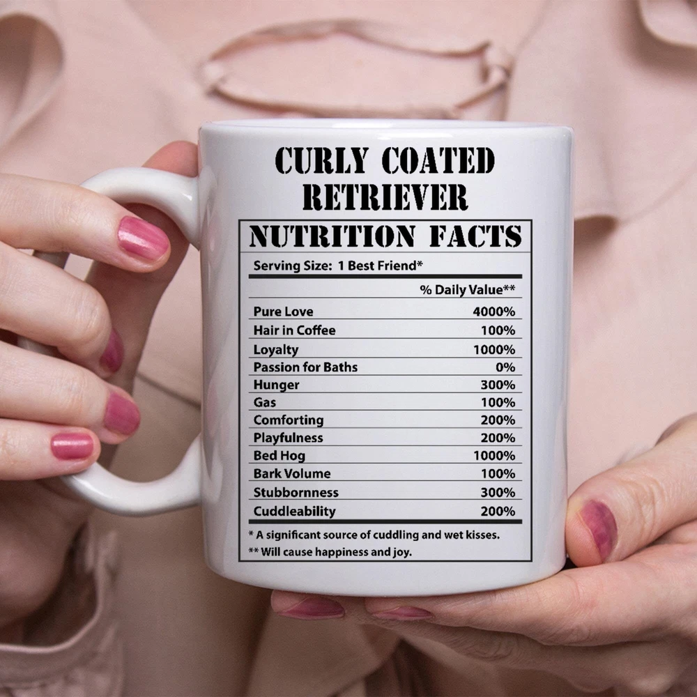 Funny Curly Coated Retriever Gifts Nutritional Facts White Coffee Mug Product Details.. This high quality 11oz. ceramic white mug has a premium hard coat that provides crisp and vibrant color reproduction sure to last for years. Perfect for all hot & cold beverages. The highest quality printing possible is used. It will never fade no matter how many times you wash it. Material: 100% Ceramic. Print both sides. Dishwasher and Microwave Safe. High Gloss + Premium White Finish. Printed in the U.S.A. Personalized & Custom. We support personalized and custom mug to add custom, when placing an order, you can add notes to the "order note" in shipping address section. Also you can contact us directly via message. Shipping Info. Ready to ship in 1 to 2 business days, All products are made-to-order and proudly printed in the United States. Shipped by USPS and DHL, You will receive your order in 5-7 days. Replace & Refund. All products are defective during shipping broken, chipped will be replaced free of charge. You are not satisfied with the product, we will refund 100% money to you. If any other issues arise, please do not hesitate to message, we would be more than happy to assist you.