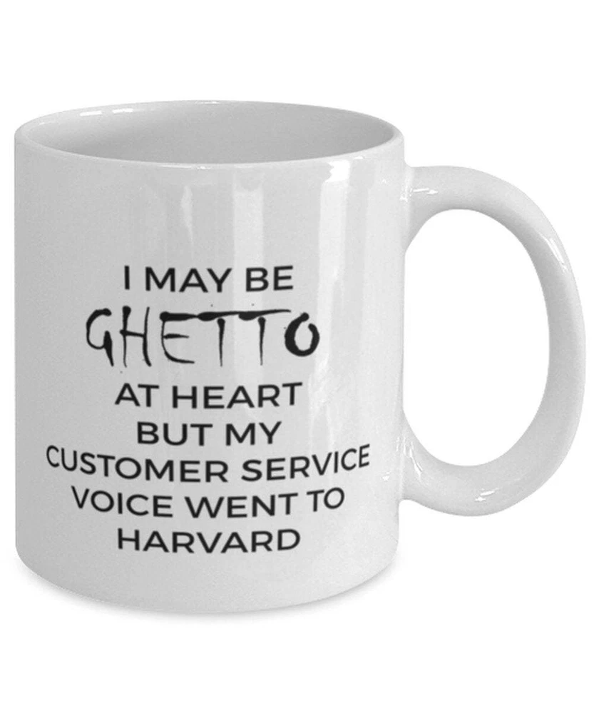 Funny Customer Service Coffee Mug I May Be Ghetto At Heart But My Customer Mug Product Details.. This high quality 11oz. ceramic white mug has a premium hard coat that provides crisp and vibrant color reproduction sure to last for years. Perfect for all hot & cold beverages. The highest quality printing possible is used. It will never fade no matter how many times you wash it. Material: 100% Ceramic. Print both sides. Dishwasher and Microwave Safe. High Gloss + Premium White Finish. Printed in the U.S.A. Personalized & Custom. We support personalized and custom mug to add custom, when placing an order, you can add notes to the "order note" in shipping address section. Also you can contact us directly via message. Shipping Info. Ready to ship in 1 to 2 business days, All products are made-to-order and proudly printed in the United States. Shipped by USPS and DHL, You will receive your order in 5-7 days. Replace & Refund. All products are defective during shipping broken, chipped will be replaced free of charge. You are not satisfied with the product, we will refund 100% money to you. If any other issues arise, please do not hesitate to message, we would be more than happy to assist you.