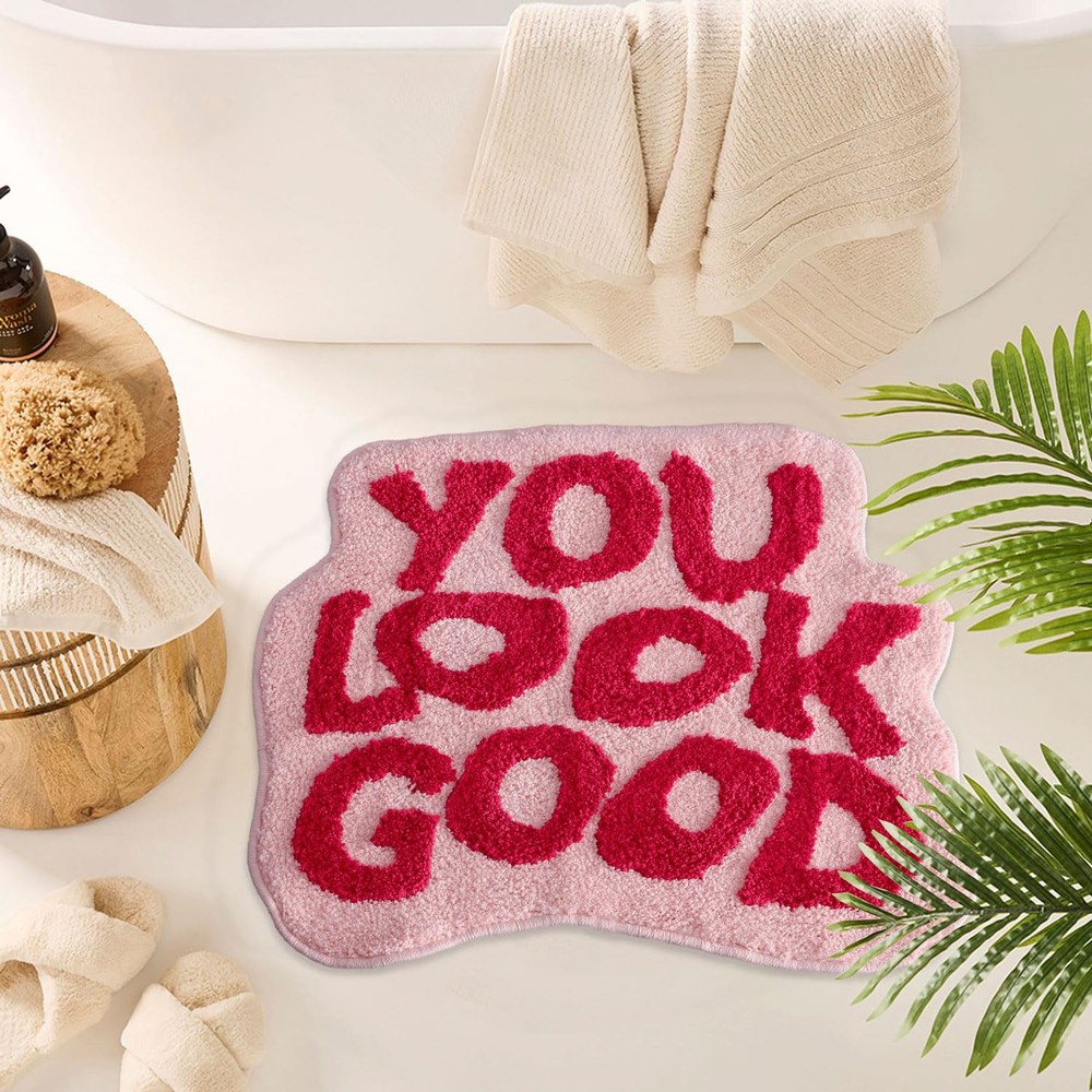 [Soft and High-quality Fabric: ] The surface of the you look good bath mat is made of 100% polyester microfiber material.Our high-density cute funny bathroom rugs are more thicker and protect your feet from cold bathroom floor, you will feel softer and comfortable. [NON-SKID TP RUBBER BACKING:] The bottom is made of TPR, have a good effect on the slippery bathroom.More durable and more safer for kids and the elderly. NOTICE: Keep the bottom of the funny rug dry. Water under cool bath mat can cause it to slip. [High and Low Pile Fluff Design :] The soft small you look good rug with high and low pile fluff design will pampers your feet makes you feel like walking on the clouds.dense high and low pile fluff design captures excess moisture to help keep your floor clean and dry when you get out of the shower [ULTRA ABSORBENT :] The shaggy microfiber has super strong water absorption, which will absorb water in a few seconds and quickly dry it to protect your floor from dripping. The cool rug will keep your feet cozy and warm, while rapidly absorbing any water that lands on it. No worry that funny bath mat fade and fibers come away. [Machine Wash :] Machine wash separately in cold water. Do not use chlorine bleach. Tumble dry on low setting and shake to restore fluff. The cute you look good rug can be used for apartment decor , bathroom doormat, laundry room, kid’s bedroom, living room, kitchen sink as area rug and floor rug. Add some fun and positivity to your bathroom or front door with this uplifting you look good small bath mat! It is the best choice for gifts for family and friends.