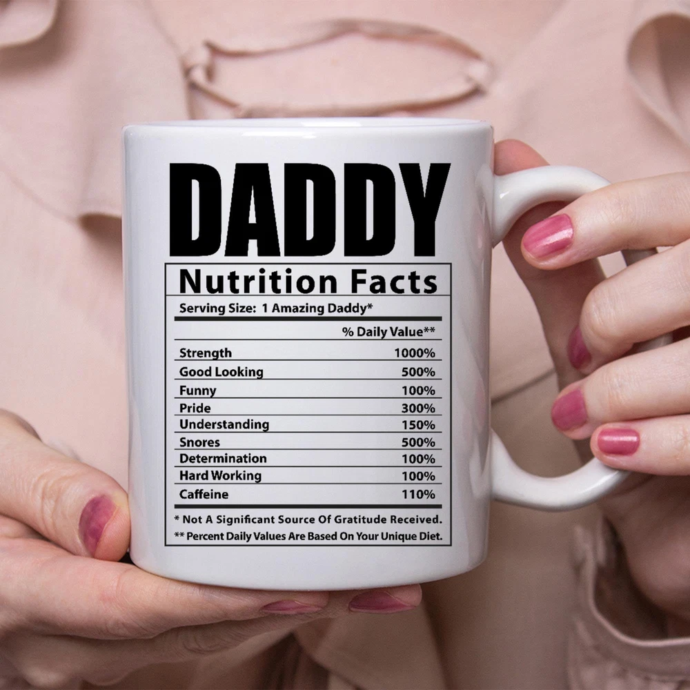 Funny Daddy Gifts Nutritional Facts White Coffee Mug Product Details.. This high quality 11oz. ceramic white mug has a premium hard coat that provides crisp and vibrant color reproduction sure to last for years. Perfect for all hot & cold beverages. The highest quality printing possible is used. It will never fade no matter how many times you wash it. Material: 100% Ceramic. Print both sides. Dishwasher and Microwave Safe. High Gloss + Premium White Finish. Printed in the U.S.A. Personalized & Custom. We support personalized and custom mug to add custom, when placing an order, you can add notes to the "order note" in shipping address section. Also you can contact us directly via message. Shipping Info. Ready to ship in 1 to 2 business days, All products are made-to-order and proudly printed in the United States. Shipped by USPS and DHL, You will receive your order in 5-7 days. Replace & Refund. All products are defective during shipping broken, chipped will be replaced free of charge. You are not satisfied with the product, we will refund 100% money to you. If any other issues arise, please do not hesitate to message, we would be more than happy to assist you.