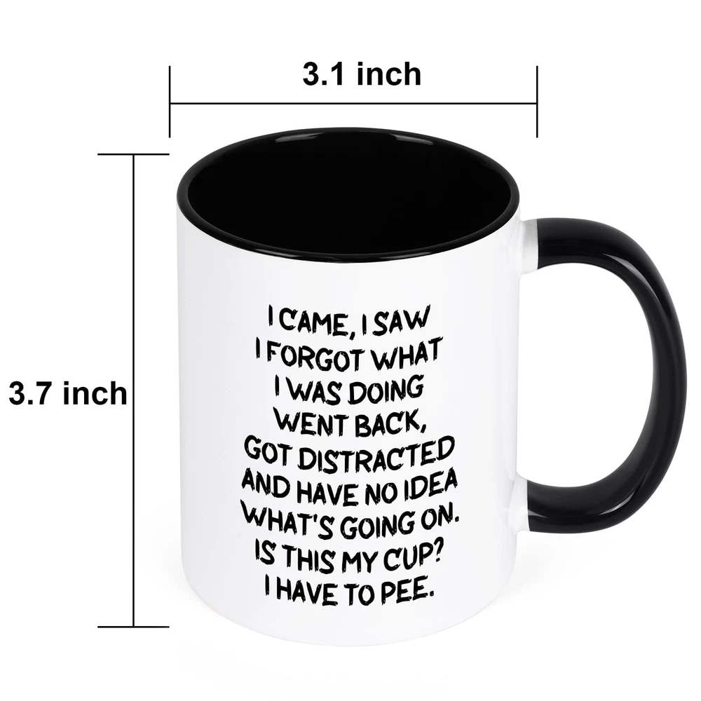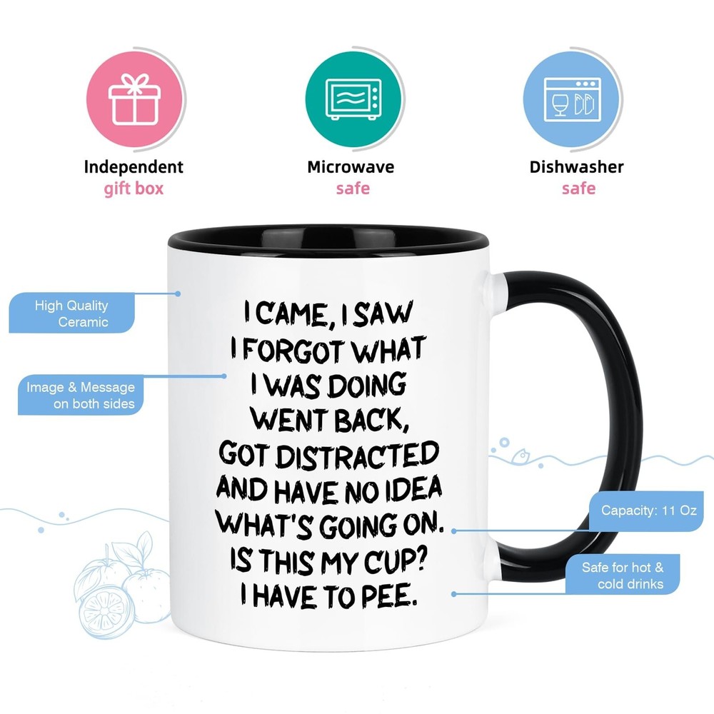 Cabtnca Gifts for Elderly Women Men, Elderly Gifts, Funny Mug for the Elderly, Senior Citizen Gifts, Old People Gifts, Christmas Birthday Gifts for Senior Women Men Old People, 11 Oz Product Details Color: White/Black Brand: Cabtnca MPN: CC1225-BH UPC: Does not apply EAN: Does not apply Brand: Cabtnca Color: White/Black Special Feature: Manual Style: Fine Theme: Holiday Brand: Cabtnca Color: White/Black Special Feature: Manual Style: Fine Theme: Holiday Occasion: Christmas Included Components: Mugs Unit Count: 1.0 Count Product Dimensions: 3.1"W x 3.1"H Number of Items: 1 Item Weight: 13.7 ounces Item model number: CC1225-BH Date First Available: September 12, 2024 FUNNY GIFTS FOR ELDERLY MEN: Embrace the wisdom of age with every sip! The funny mugs are great gifts for the young at heart, or just the forgetful elderly. Whether celebrating a birthday, retirement, Christmas, or any other important occasion, this mug is guaranteed to bring joy and laughter HIGH-QUALITY CERAMIC COFFEE MUG: The funny coffee mug is made from high quality food grade ceramic fired at high temperature, so they are safe and odorless. The cups can hold up to 11 ounces and can hold any hot or cold drink, including tea, beer, or any other beverage they want DOUBLE-SIDED PRINT: The elderly gifts are printed on both sides with the words " I CAME, I SAW, I FORGOT WHAT I WAS DOING" . The text is clear and there is no need to worry about the printing fading, cracking or peeling Dishwasher and Microwave Safe: The senior citizen gifts are made of high quality ceramic and safety ink, which are very safe and environmentally friendly. You can wash it in the dishwasher, which is very convenient and hygienic. And you can also be safely heated using microwaves for coffee or tea THOUGHTFUL DESIGN: Unlike ordinary containers, these old people gifts focus on human design. The cup has an ergonomic C-shaped handle that makes it comfortable to hold. The bottom of the cup has a non-slip design, which is not easy to slip