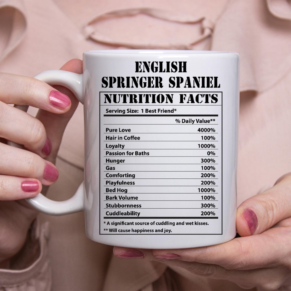 Funny English Springer Spaniel Gifts Nutritional Facts White Coffee Mug Product Details.. This high quality 11oz. ceramic white mug has a premium hard coat that provides crisp and vibrant color reproduction sure to last for years. Perfect for all hot & cold beverages. The highest quality printing possible is used. It will never fade no matter how many times you wash it. Material: 100% Ceramic. Print both sides. Dishwasher and Microwave Safe. High Gloss + Premium White Finish. Printed in the U.S.A. Personalized & Custom. We support personalized and custom mug to add custom, when placing an order, you can add notes to the "order note" in shipping address section. Also you can contact us directly via message. Shipping Info. Ready to ship in 1 to 2 business days, All products are made-to-order and proudly printed in the United States. Shipped by USPS and DHL, You will receive your order in 5-7 days. Replace & Refund. All products are defective during shipping broken, chipped will be replaced free of charge. You are not satisfied with the product, we will refund 100% money to you. If any other issues arise, please do not hesitate to message, we would be more than happy to assist you.
