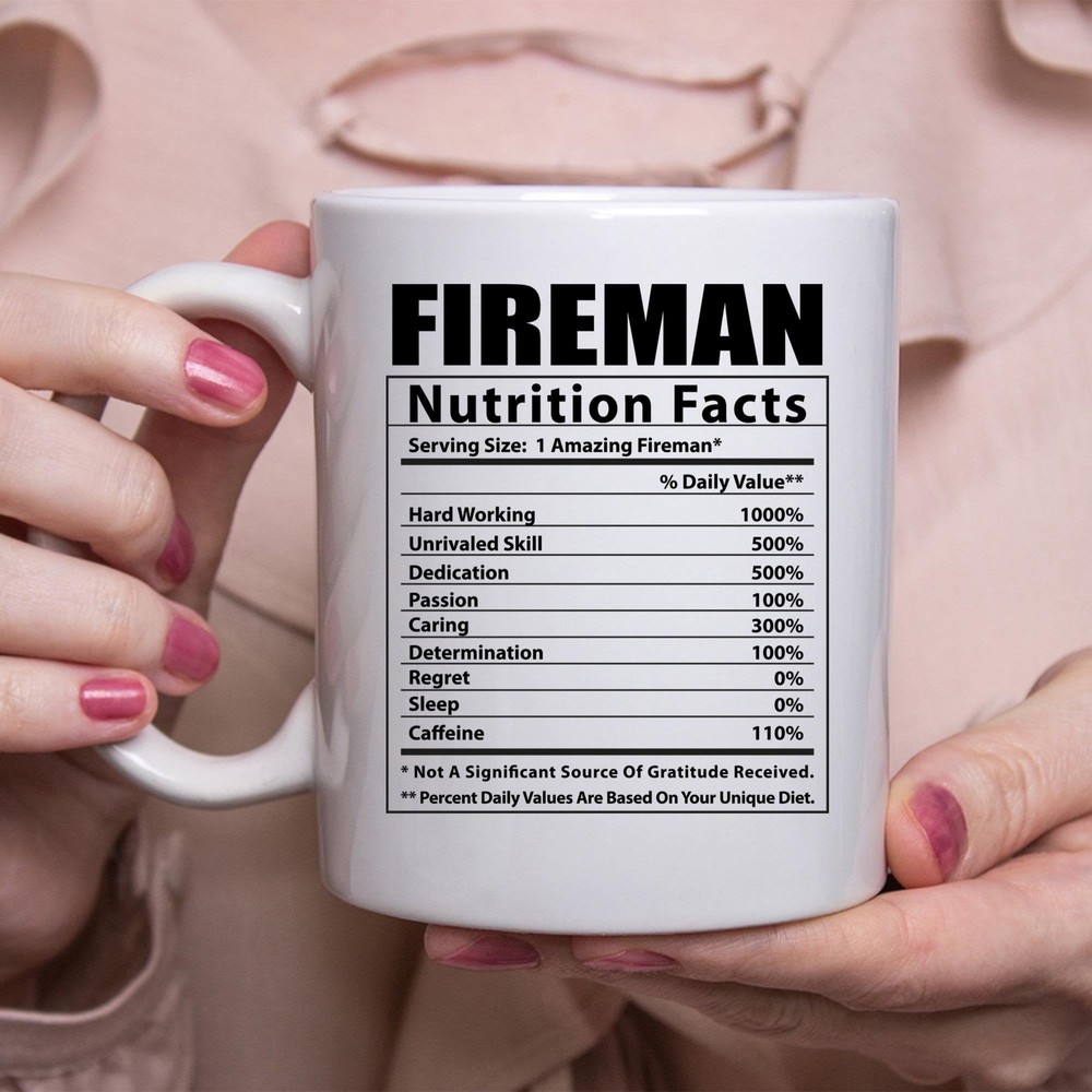 Funny Fireman Nutritional Facts White Coffee Mug Product Details.. This high quality 11oz. ceramic white mug has a premium hard coat that provides crisp and vibrant color reproduction sure to last for years. Perfect for all hot & cold beverages. The highest quality printing possible is used. It will never fade no matter how many times you wash it. Material: 100% Ceramic. Print both sides. Dishwasher and Microwave Safe. High Gloss + Premium White Finish. Printed in the U.S.A. Personalized & Custom. We support personalized and custom mug to add custom, when placing an order, you can add notes to the "order note" in shipping address section. Also you can contact us directly via message. Shipping Info. Ready to ship in 1 to 2 business days, All products are made-to-order and proudly printed in the United States. Shipped by USPS and DHL, You will receive your order in 5-7 days. Replace & Refund. All products are defective during shipping broken, chipped will be replaced free of charge. You are not satisfied with the product, we will refund 100% money to you. If any other issues arise, please do not hesitate to message, we would be more than happy to assist you.
