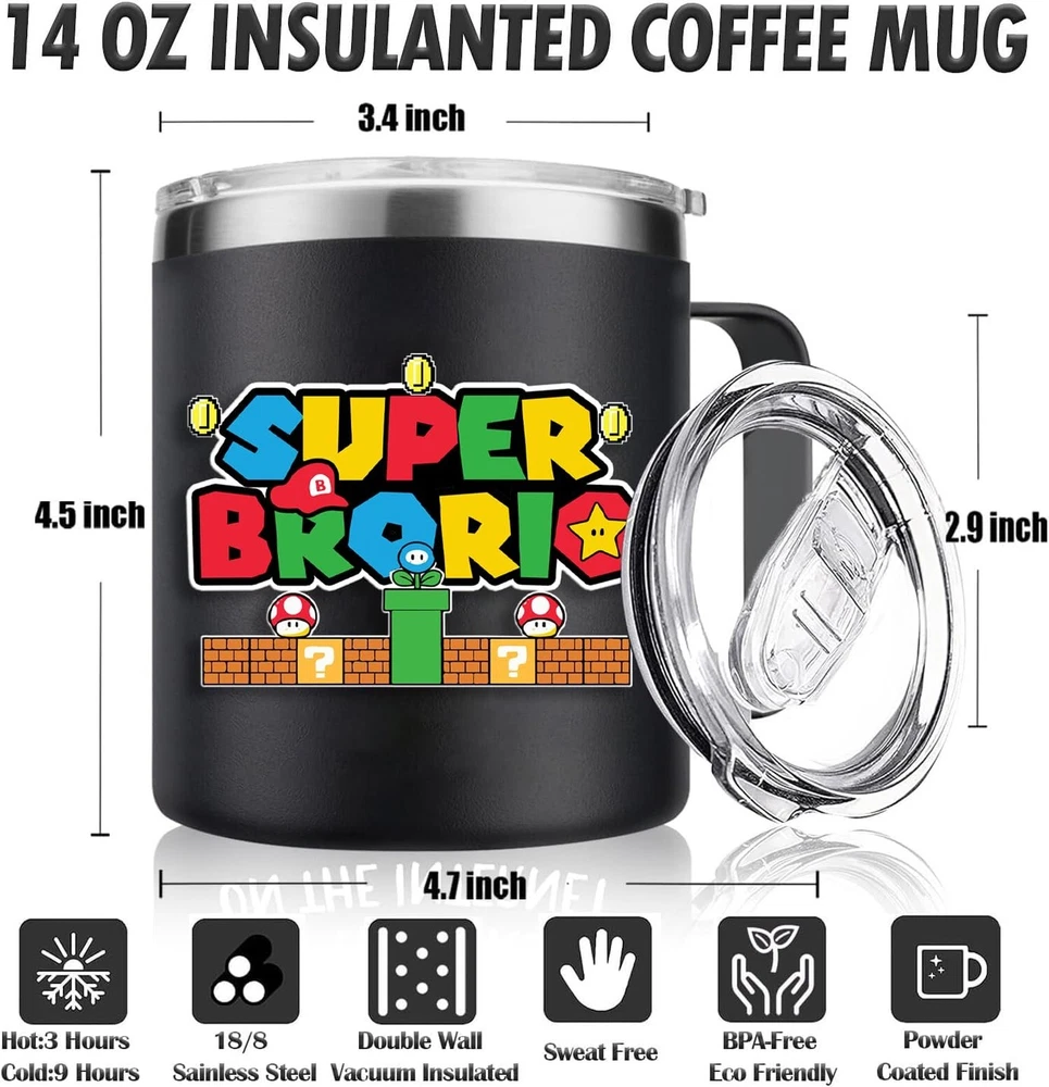 Funny Gifts for Brother Adult-Birthday Brother Gifts from Sister-Big Brother Gifts for Boy-Christmas Gifts for Brother-Best Gifts for Brother Dad Husband Son Boyfriend Him(14oz) Product Details Color: Super Bro Brand: NIAEIAIE MPN: Coffee Mug-005 UPC: 768795388726 EAN: 0768795388726 Brand: NIAEIAIE Color: Super Bro Special Feature: BPA sealing cap, Keep warm and cold for 3-9 hours, Dishwasher available, 304 food grade stainless steel See more Style: Super Bro Theme: Funny brother gifts for gamer Reusability: Reusable Material Type Free: BPA Free Product Care Instructions: Hand Wash Only Material Features: Insulated Stainless Steel Material Type: Stainless Steel, BPA-free lid Number of Items: 1 Item Dimensions W x H: 4"W x 3"H Unit Count: 14.0 Ounce Capacity: 14 ounces Manufacturer: NIAEIAIE UPC: 768795388726 Age Range Description: Adult Package Type: standard packaging Brand Name: NIAEIAIE Recommended Uses For Product: Travel, Home Built-In Media: BPA Free Specific Uses For Product: Cold Drinks, Hot Drinks Shape: 14 OZ Stainless Steel Coffee Mug Pattern: Super Bro Theme: Funny brother gifts for gamer Occasion: Christmas, Anniversary, Father's Day, Birthday, Thanksgiving Color: Super Bro Style Name: Super Bro Additional Features: BPA sealing cap, Keep warm and cold for 3-9 hours, Dishwasher available, 304 food grade stainless steel BEST GIFTS FOR BROTHER GAME LOVERThis a super funny bro gifts,is specially designed for brother/sister game lover,This brother mug is the perfect birthday gift idea as brother gifts from sister, funny brother gifts, gifts for brother adult, brother birthday gifts, birthday gifts for brother adult, gifts for older brother, big brother gifts, brother wedding gifts from sister, graduation gifts for brother, gift for gamer FUNNY BROTHER BIRTHDAY GIFT Can be used as a Father's Day, birthday, Christmas, Valentine's Day, Thanksgiving, graduation, appreciation or thank you gift. As best brother ever,worlds best brother mug, Your brother will be able to use it for ice tea,beer,champagne,smoothies,protein shakes,and so much more, celebrate the festival for brother.it is the best choice to express your love LEAK PROOFThese 'super bro' tumbler mug comes with a great spill-proof, BPA-free flip lid. It will not leak and is easy to use and drink from. Anti-clogging holes ensure smooth water flow for a comfortable drinking experience VACUUM INSULATED TECHNOLOGYThis coffee mug is made of food-grade 18/8 stainless steel, double-walled vacuum insulation technology, this travel coffee mug can keep your favorite beverages hot for 3+ hours and cold for 9+ hours in the normal temperature environment. Comes with a clear BPA-free lid,The slide button design of lids protect against splashes and is convenient for straw and sipping PERFECT SIZE AND VERSATILITYTough and durable construction featuring ergonomically designed handle with soft touch grip,You could use it for drinking coffee, wine, tea, juice and other beverages. Perfect for enjoying drinks in outdoor or indoor,perfect present for friend, coworker, colleague or boss