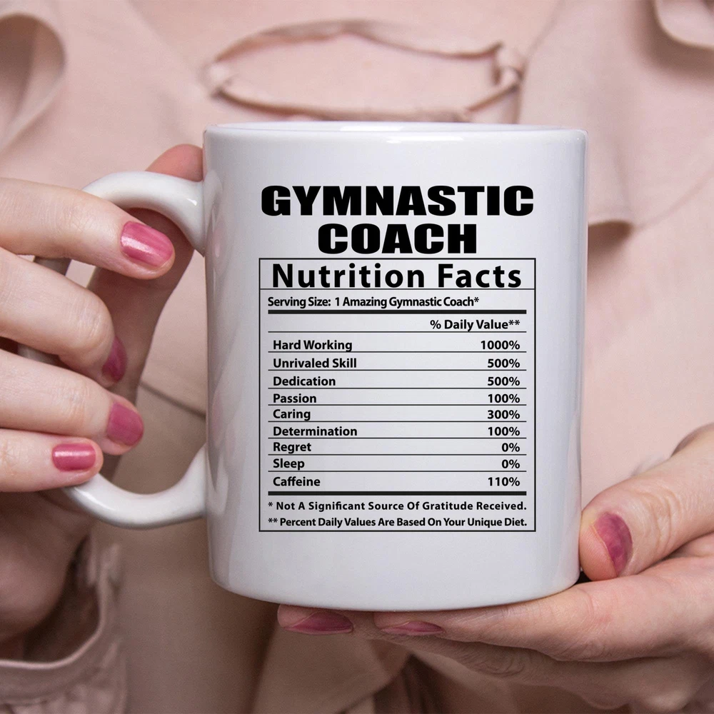 Funny Gymnastic Coach Nutritional Facts White Coffee Mug Product Details.. This high quality 11oz. ceramic white mug has a premium hard coat that provides crisp and vibrant color reproduction sure to last for years. Perfect for all hot & cold beverages. The highest quality printing possible is used. It will never fade no matter how many times you wash it. Material: 100% Ceramic. Print both sides. Dishwasher and Microwave Safe. High Gloss + Premium White Finish. Printed in the U.S.A. Personalized & Custom. We support personalized and custom mug to add custom, when placing an order, you can add notes to the "order note" in shipping address section. Also you can contact us directly via message. Shipping Info. Ready to ship in 1 to 2 business days, All products are made-to-order and proudly printed in the United States. Shipped by USPS and DHL, You will receive your order in 5-7 days. Replace & Refund. All products are defective during shipping broken, chipped will be replaced free of charge. You are not satisfied with the product, we will refund 100% money to you. If any other issues arise, please do not hesitate to message, we would be more than happy to assist you.