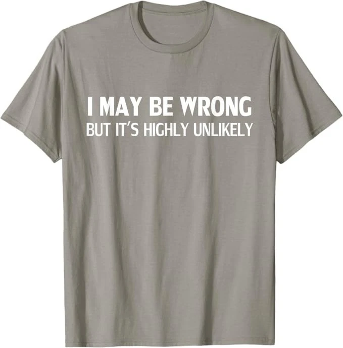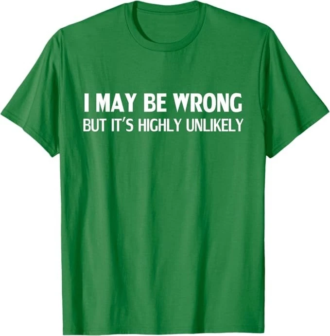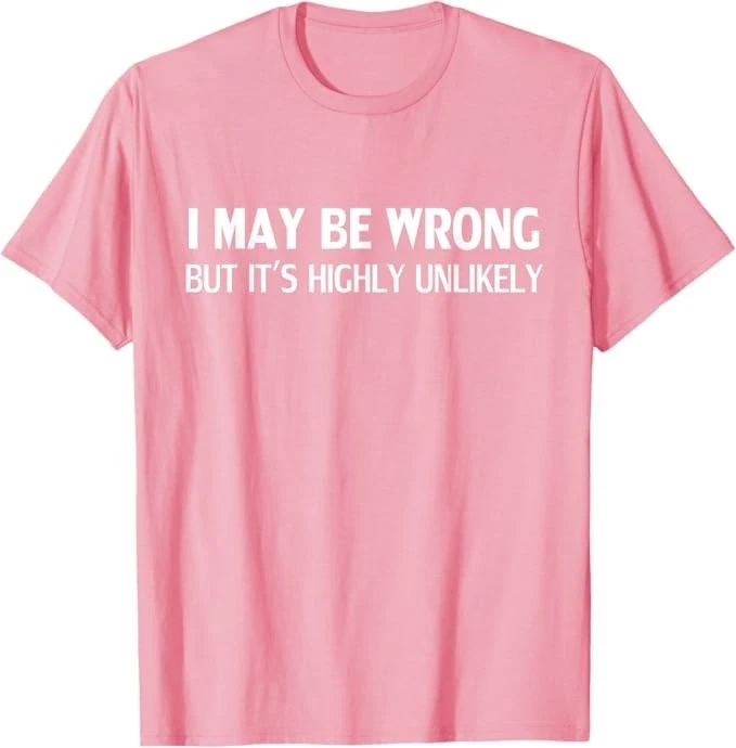 Funny I May Be Wrong But It's Highly Unlikely T-Shirt Designed and Printed in USA Product Features: • Classic Look and Feel: This ultra cotton tee offer the timeless appeal of traditional cotton. The high-quality print enhances its casual appearance. • Material: Made from 6.1-ounce, 100% cotton. (Note: Dark Heather variant is 50% cotton, 50% polyester.) • Durability: Features double-needle stitching on the neck, sleeves, and hem for added durability. Designed for a roomy, unisex fit. • Print Type: DTG (Direct to Garment) • Manufacturer: Gildan 5000, 5000b (Made in USA) Shipping Information: • Handling Time: With POD(Print-On-Demand) product model, we typically require about 3 business-days handling time before shipping. In most cases, our handling time’s , rang e from 1-2 business days. • Delivery Time: • USA: Approximately 2 -6 business days • Canada: Approximately 6-10 business days (We currently don’t offer international Shipping) • Worldwide: Approximately 15-25 business days (We Currently don’t offer international Shipping) • Shipping Carriers: USPS and DHL • Note: Business days exclude weekends and holidays. Return & Exchange Policy: • Quality Guarantee: We stand behind the quality of our products and workmanship . Any defects or errors on our part must result in a refund/ replacement at no charge. • Conditions for Returns: Returns are generally not accepted for user errors such as incorrect selection of sizes, designs, or colors. Returns /Replacements are acceptable for damages such as poor printing results, incorrect size or design caused by us. • Note: Please reach out to us if there are any questions or issue s with your item, we’ll do our best to resolve any issue you might have. Note: • We’re glad to have your support! If you have a moment, y our honest feedback is very valuable to us. Thank you!
