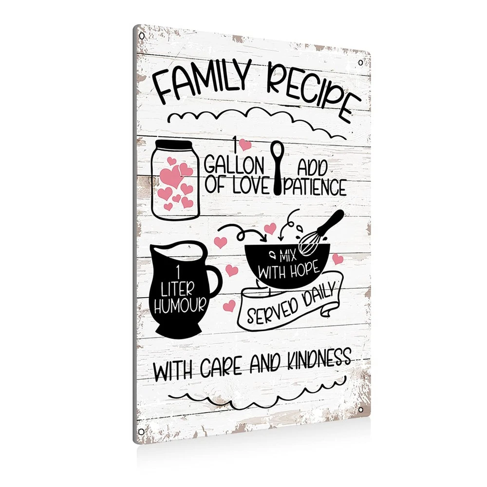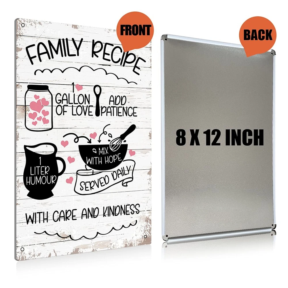 Funny Kitchen Family Recipe Metal Tin Sign Wall Art Decor Kitchen Sign Farmhouse Home Rustic Decor Gifts Product Details Color: white Brand: BEASTZHENG Material: Metal Theme: Family Recommended Uses For Product: Office Mounting Type: Wall Mount Product Dimensions: 12"L x 12"W Shape: Rectangular Style: Durable Pre-printed: Family Recipe UPC: 676055329399 Item Weight: 0.81 ounces Manufacturer: BEASTZHENG MATERIAL: Made of high-quality aluminum material. High quality and durable. SIZE:8 x 12 inches. EASY TO INSTALL: Equipped with 4 pre-drilled holes. Installation is easy and fast. GREAT DECORATION: This tin sign is very suitable for home or office decoration. It can reflect your personal taste very well. At the same time, it can also improve the atmosphere of the home or office. GIFT: This is a perfect gift choice. It can be used by yourself or given to the one you love. It is suitable for various occasions, such as Christmas, Thanksgiving, Valentine's Day, graduation, housewarming, wedding, Father's Day, Mother's Day, birthday, etc. GIFT: This is a perfect gift choice. It can be used by yourself or given to the one you love. It is suitable for various occasions, such as Christmas, Thanksgiving, Valentine's Day, graduation, housewarming, wedding, Father's Day, Mother's Day, birthday, etc.