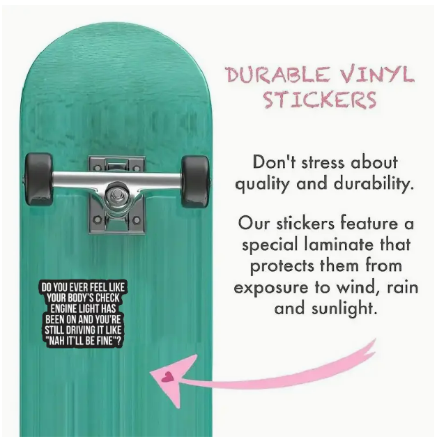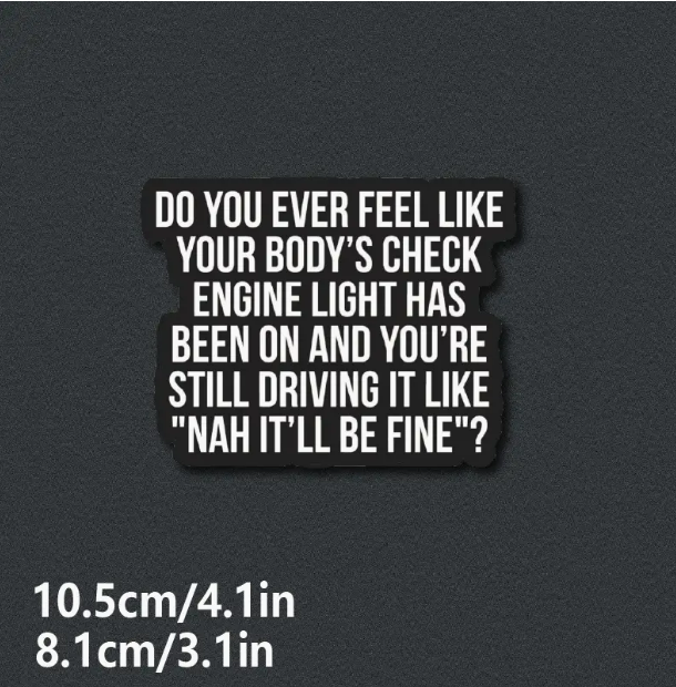 📝 Description: If you've ever laughed through the chaos, this sticker is for you. Featuring the relatable quote: "Do you ever feel like your body’s check engine light has been on and you're still driving it like 'nah it’ll be fine'?" This durable, high-quality vinyl sticker makes the perfect addition to your laptop, water bottle, journal, or even your emotional support toolbox. 💡 Product Details: Size: 4.1" x 3.1" (10.5 cm x 8.1 cm) Material: Premium vinyl with protective laminate Finish: Matte or semi-gloss (as shown) Weatherproof: Water, sun, and scratch resistant Adhesive: Strong hold, residue-free removal 🎯 Use It On: Laptops Water bottles Skateboards Cars Mirrors Journals, notebooks, or planners 📦 Condition: Brand New – Ships flat with a protective sleeve 🔍 SEO Keywords: funny mental health sticker, check engine light decal, relatable quote sticker, waterproof vinyl sticker, therapy humor, emotional exhaustion joke, burnout sticker, laptop quote decal