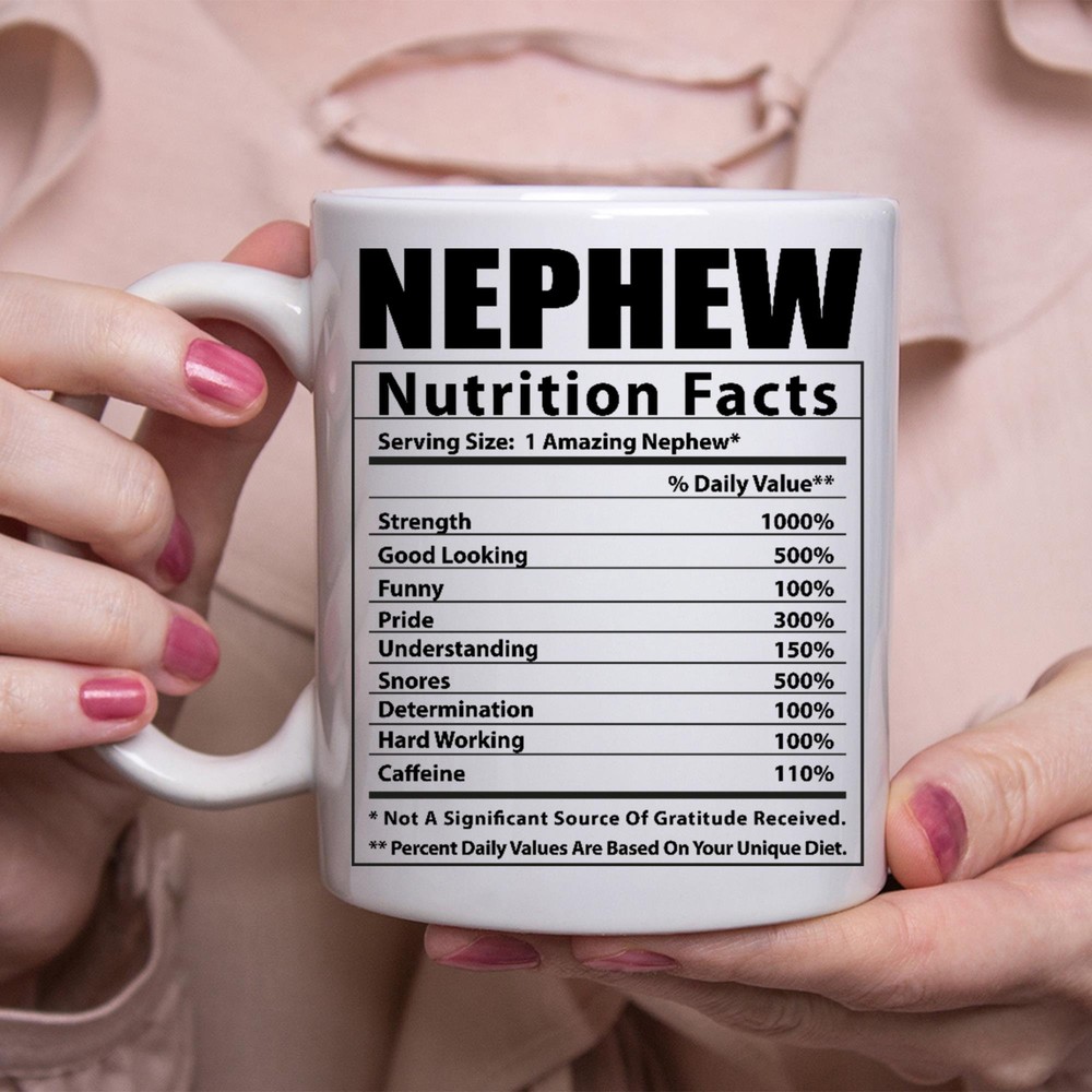 Funny Nephew Gifts Nutritional Facts White Coffee Mug Product Details.. This high quality 11oz. ceramic white mug has a premium hard coat that provides crisp and vibrant color reproduction sure to last for years. Perfect for all hot & cold beverages. The highest quality printing possible is used. It will never fade no matter how many times you wash it. Material: 100% Ceramic. Print both sides. Dishwasher and Microwave Safe. High Gloss + Premium White Finish. Printed in the U.S.A. Personalized & Custom. We support personalized and custom mug to add custom, when placing an order, you can add notes to the "order note" in shipping address section. Also you can contact us directly via message. Shipping Info. Ready to ship in 1 to 2 business days, All products are made-to-order and proudly printed in the United States. Shipped by USPS and DHL, You will receive your order in 5-7 days. Replace & Refund. All products are defective during shipping broken, chipped will be replaced free of charge. You are not satisfied with the product, we will refund 100% money to you. If any other issues arise, please do not hesitate to message, we would be more than happy to assist you.