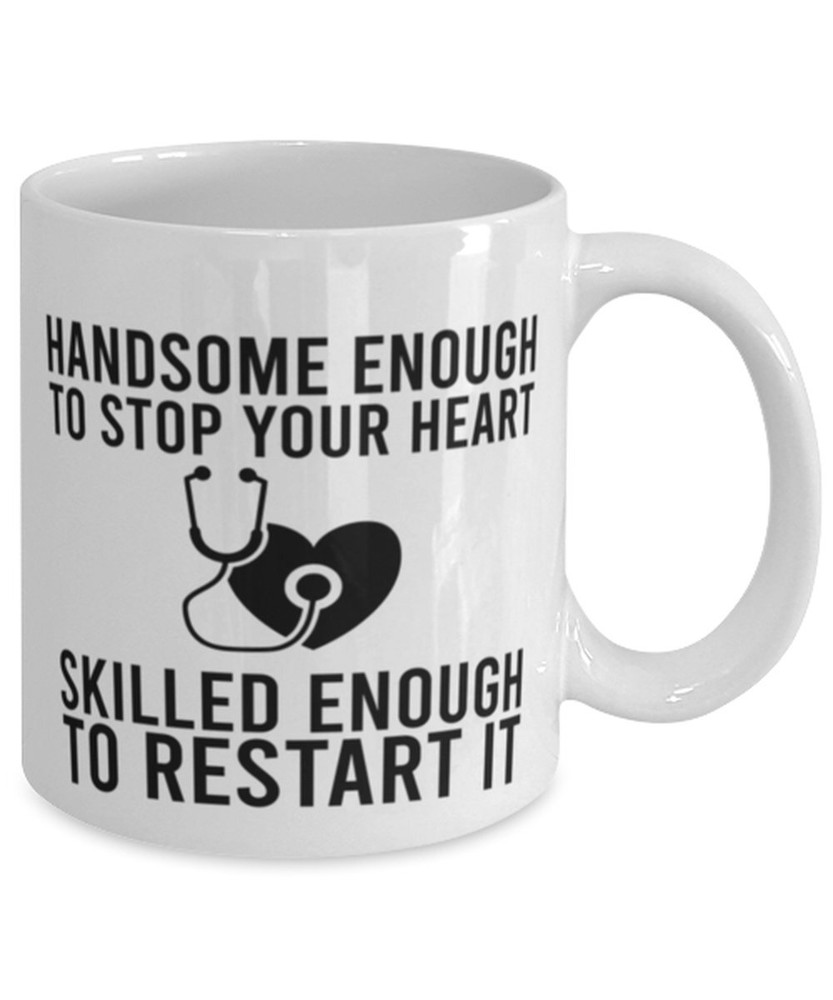 For Him Nurse Funny Graduation Coffee Mug Handsome Enough To Stop Your Heart Mug Product Details.. This high quality 11oz. ceramic white mug has a premium hard coat that provides crisp and vibrant color reproduction sure to last for years. Perfect for all hot & cold beverages. The highest quality printing possible is used. It will never fade no matter how many times you wash it. Material: 100% Ceramic. Print both sides. Dishwasher and Microwave Safe. High Gloss + Premium White Finish. Printed in the U.S.A. Personalized & Custom. We support personalized and custom mug to add custom, when placing an order, you can add notes to the "order note" in shipping address section. Also you can contact us directly via message. Shipping Info. Ready to ship in 1 to 2 business days, All products are made-to-order and proudly printed in the United States. Shipped by USPS and DHL, You will receive your order in 5-7 days. Replace & Refund. All products are defective during shipping broken, chipped will be replaced free of charge. You are not satisfied with the product, we will refund 100% money to you. If any other issues arise, please do not hesitate to message, we would be more than happy to assist you.