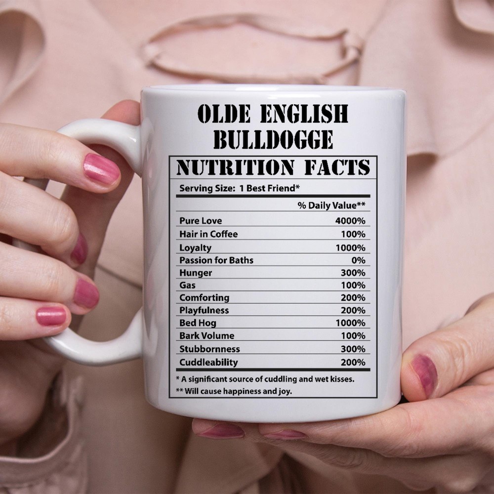 Funny Olde English Bulldogge Gifts Nutritional Facts White Coffee Mug Product Details.. This high quality 11oz. ceramic white mug has a premium hard coat that provides crisp and vibrant color reproduction sure to last for years. Perfect for all hot & cold beverages. The highest quality printing possible is used. It will never fade no matter how many times you wash it. Material: 100% Ceramic. Print both sides. Dishwasher and Microwave Safe. High Gloss + Premium White Finish. Printed in the U.S.A. Personalized & Custom. We support personalized and custom mug to add custom, when placing an order, you can add notes to the "order note" in shipping address section. Also you can contact us directly via message. Shipping Info. Ready to ship in 1 to 2 business days, All products are made-to-order and proudly printed in the United States. Shipped by USPS and DHL, You will receive your order in 5-7 days. Replace & Refund. All products are defective during shipping broken, chipped will be replaced free of charge. You are not satisfied with the product, we will refund 100% money to you. If any other issues arise, please do not hesitate to message, we would be more than happy to assist you.