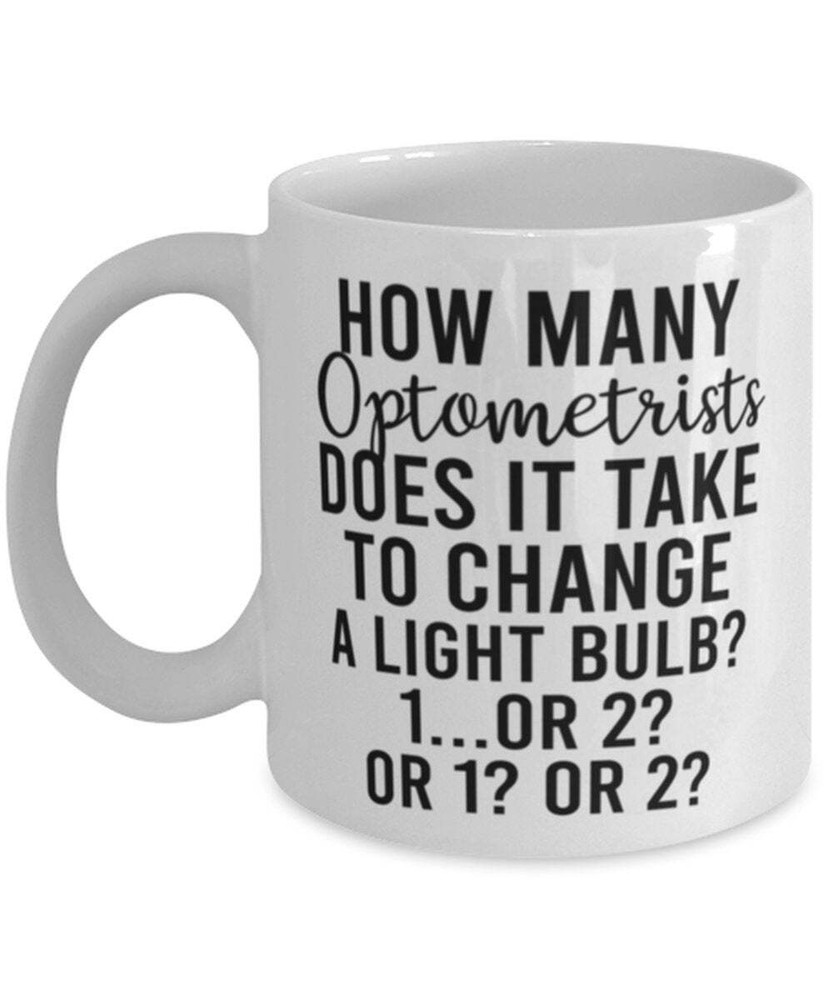 Optometrist Graduation Funny Coffee Mug How Many Optometrist Does It Take To Product Details.. This high quality 11oz. ceramic white mug has a premium hard coat that provides crisp and vibrant color reproduction sure to last for years. Perfect for all hot & cold beverages. The highest quality printing possible is used. It will never fade no matter how many times you wash it. Material: 100% Ceramic. Print both sides. Dishwasher and Microwave Safe. High Gloss + Premium White Finish. Printed in the U.S.A. Personalized & Custom. We support personalized and custom mug to add custom, when placing an order, you can add notes to the "order note" in shipping address section. Also you can contact us directly via message. Shipping Info. Ready to ship in 1 to 2 business days, All products are made-to-order and proudly printed in the United States. Shipped by USPS and DHL, You will receive your order in 5-7 days. Replace & Refund. All products are defective during shipping broken, chipped will be replaced free of charge. You are not satisfied with the product, we will refund 100% money to you. If any other issues arise, please do not hesitate to message, we would be more than happy to assist you.