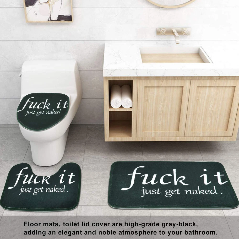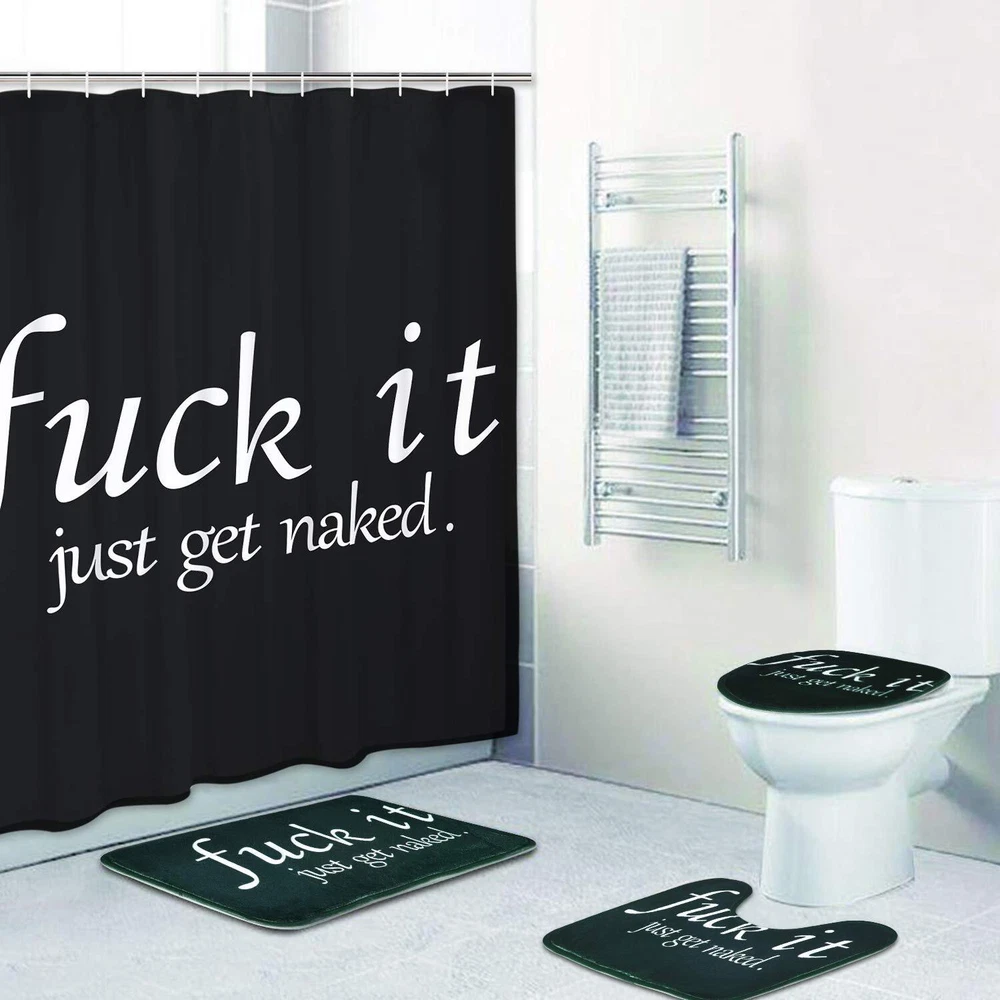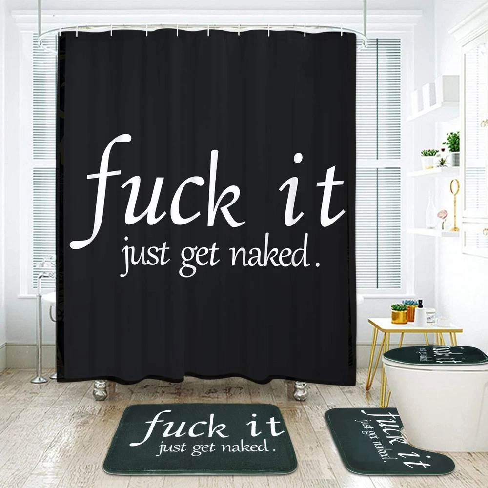 DESIGNER SAY: Our 4 piece shower curtain sets enough to keep your bathroom cleaning, funny words pattern let you add pleasure in the bath. WHY CHOOSE US: Pattern design: Black with funny words pattern, It can bring mystery and infinite fun to your bathroom. Waterproof material: Polyester, has a good waterproof effect, super soft and skin-friendly, easy to hang, do not fade. Non-Slip bathroom mat: Bathroom mat is made of high quality flannel, used in the bathroom, it can be very effective and non-slip, helping you to enjoy a pleasant bath time. Advanced technology: Adopt HD digital printing, clear vibrant design will bright up your bathroom! Easy to use: We give 12 hooks for free to our customer, ensure everyone can easy to install this shower curtain. WARM GUIDANCE: Introduction to care: Machine washable, wash in cold water, wash separately and hang dry recommended, do not use chlorine bleach, you had better iron it in low temperature. Warm Tips: Our rugs are folded, packed and shipped, may produce creases during transportation, but it will not affect normal use. After placing the heavy object on the rugs for a few days, the crease will disappear. Or you can soak it in cold water and dry before use, which can shorten the time for the crease to disappear. Size Information: The shower curtain size: 70" L × 69" W, the bathroom rug size: 23.6" L × 15.8" W, the toilet lid cover size: 16.5" L × 14.6" W, the U shape rug size: 17.7" L × 15.8" W. This bathroom set size is suitable for most bathroom. PACKAGED: 1×funny word shower curtain, 12×strong plastic hooks 1×bathroom mat, 1×toilet lid cover, 1×U shape rug ELEGANT DESIGN: Designed with funny quotes, advanced HD pattern printing technology, the black with words shower curtain image clearly, make your bathroom more fresh and have a new look. PREMIUM MATERIAL: Black and white shower curtain is made of polyester fabric, has a good waterproof effect, the bathroom mat is made of flannel, which is comfy, non-toxic and do not fade, skin soft - esp waterproof and durable. SIZES INFORMATION: The funny words shower curtain size: 70" L × 69" W, the bathroom rug size: 23.6" L × 15.8" W, the toilet lid cover size: 16.5" L × 14.6" W, the U shape rug size: 17.7" L × 15.8" W. This bathroom sets size is suitable for most bathrooms. EASY TO INSTALL: We gift 12 hooks free for you. You don't have to worry about how to install it. You can use this words shower curtain sets to decorate your bathroom, wall, window and any space where you like. EASY USE & CARE: You can dry clean or gentle hand wash in cold water. You can also easily iron it on low temperature.