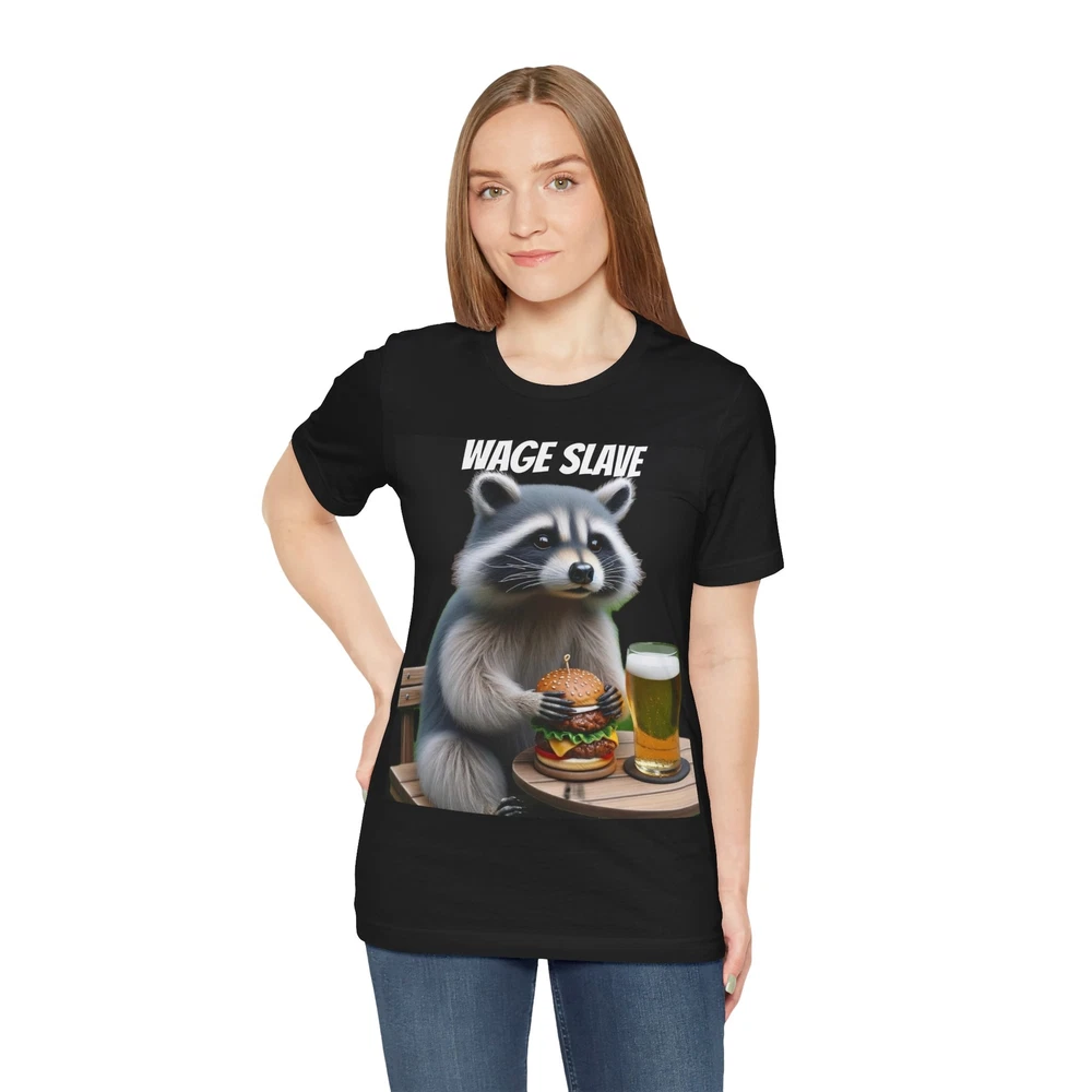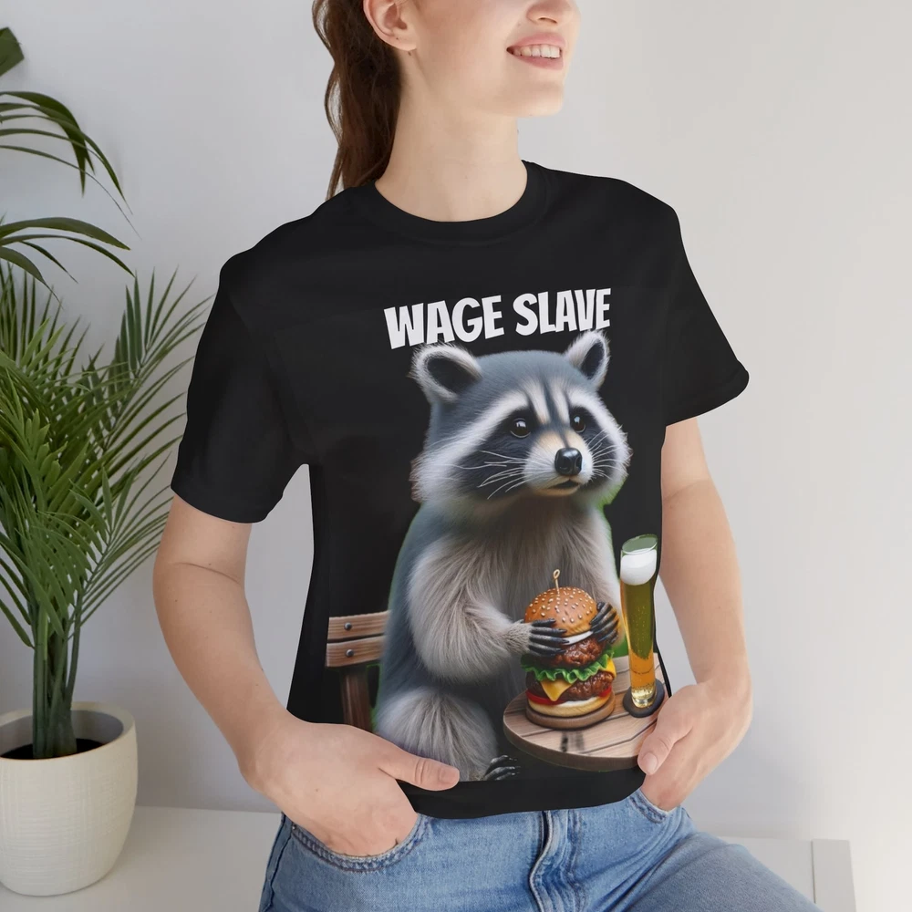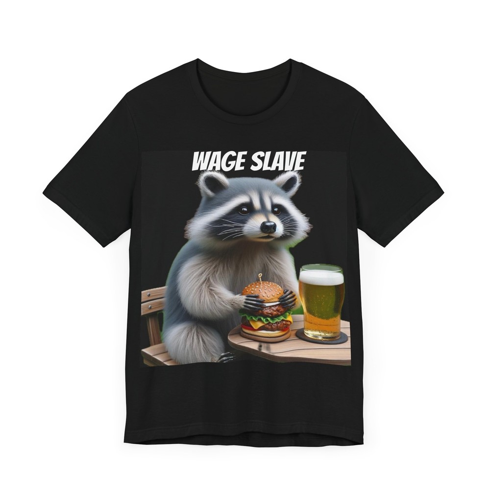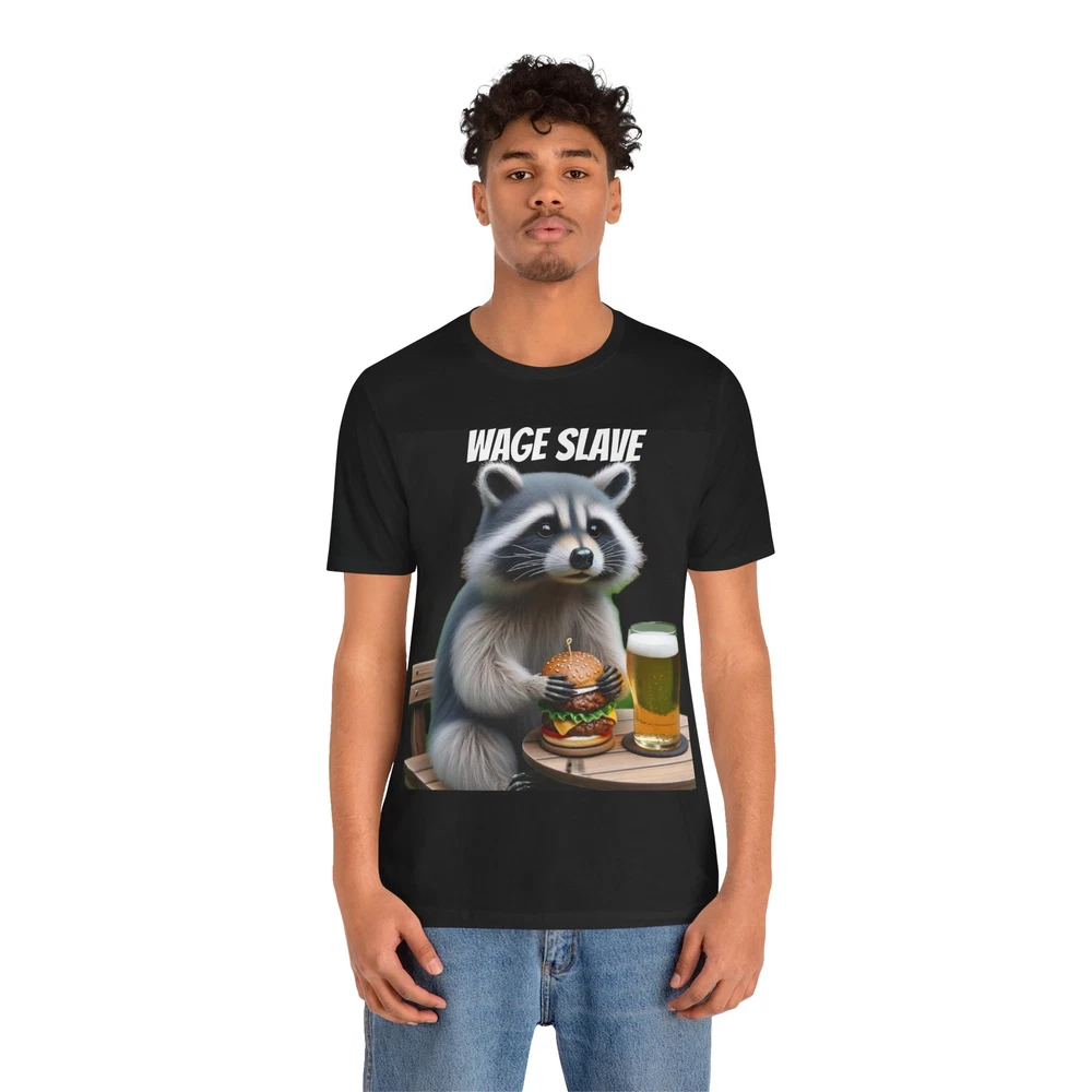 Perfect for casual outings or making a statement at social events, this shirt blends humor, critique, and wildlife in a striking illustration. Whether you're a fan of raccoons, fast food, beer, or anti-establishment messages, this t-shirt has it all. Ideal for those looking to express their individuality and challenge the status quo. Grab yours and show off your wild side!