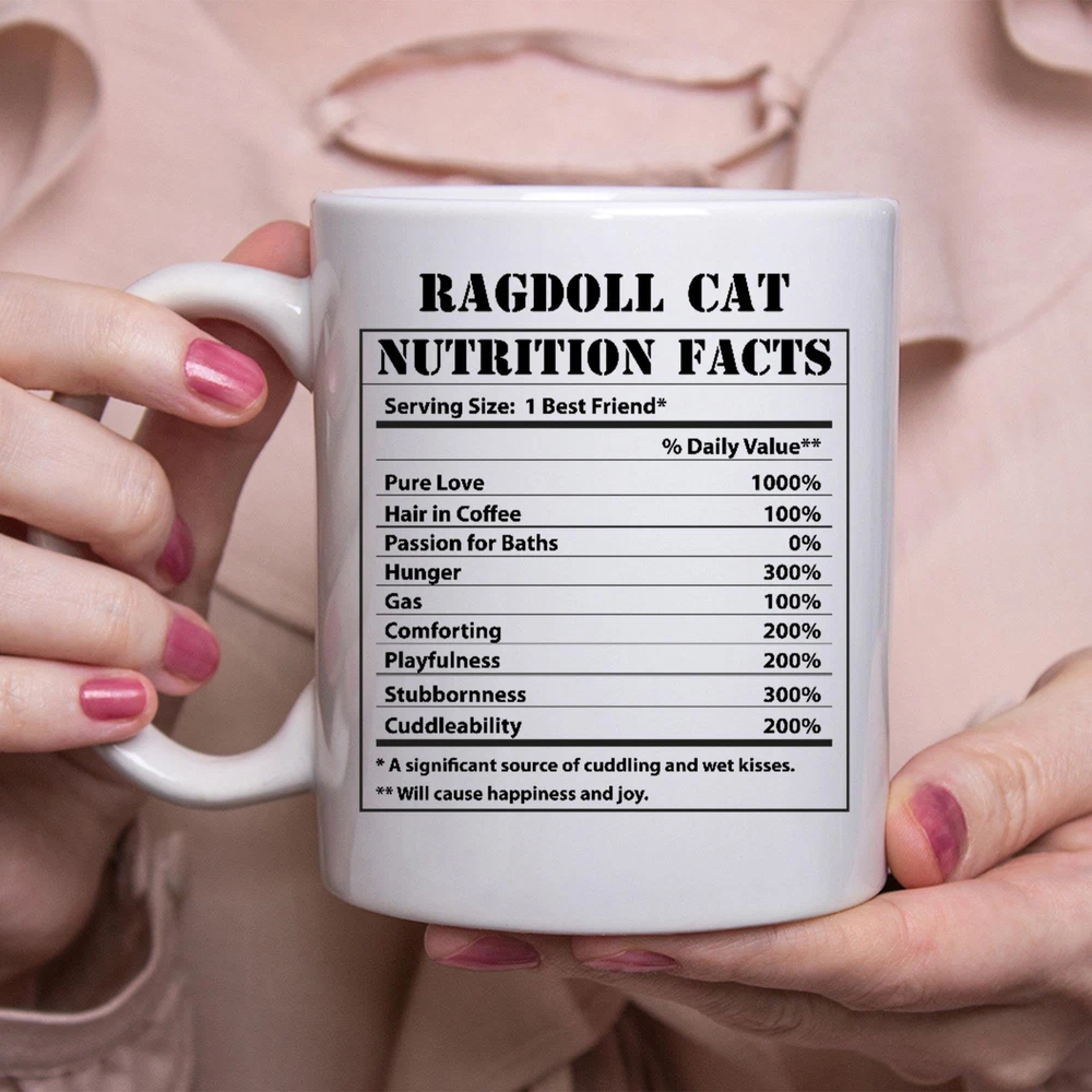 Funny Ragdoll Cat Gifts Nutritional Facts White Coffee Mug 11oz Product Details.. This high quality 11oz. ceramic white mug has a premium hard coat that provides crisp and vibrant color reproduction sure to last for years. Perfect for all hot & cold beverages. The highest quality printing possible is used. It will never fade no matter how many times you wash it. Material: 100% Ceramic. Print both sides. Dishwasher and Microwave Safe. High Gloss + Premium White Finish. Printed in the U.S.A. Personalized & Custom. We support personalized and custom mug to add custom, when placing an order, you can add notes to the "order note" in shipping address section. Also you can contact us directly via message. Shipping Info. Ready to ship in 1 to 2 business days, All products are made-to-order and proudly printed in the United States. Shipped by USPS and DHL, You will receive your order in 5-7 days. Replace & Refund. All products are defective during shipping broken, chipped will be replaced free of charge. You are not satisfied with the product, we will refund 100% money to you. If any other issues arise, please do not hesitate to message, we would be more than happy to assist you.